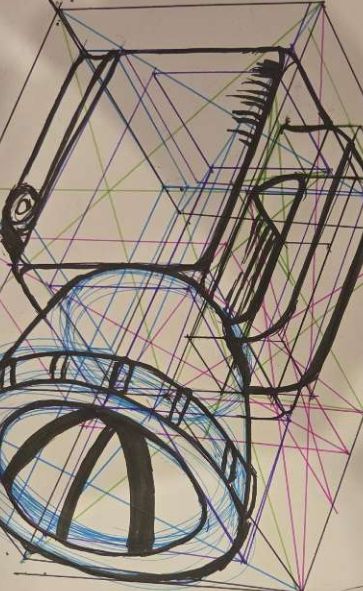 Pretty much the same things go for the pencil sharpener. I drew out what I mean, and to show some minor adjustments to align things. When it comes to these lesson 6 objects I like to start trying to get students to think about intent. With dramatic 3 point perspective, it's usually to show well...drama, or scale. There's nothing technically wrong with drawing a sharpener in such a view, but it can over complicate things and give a feeling that something is just off about it. Especially since these objects don't have much discernible convergence at their scale.