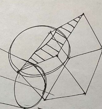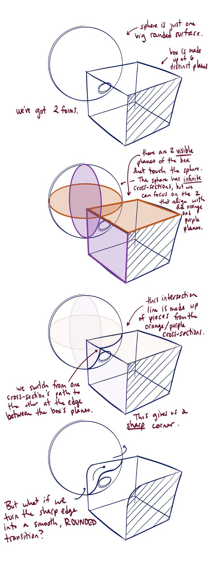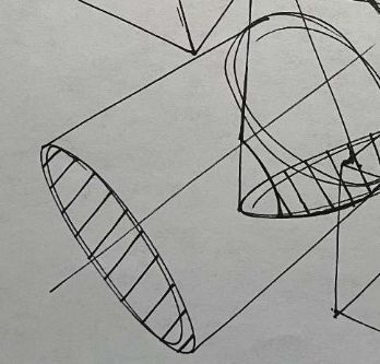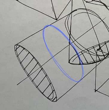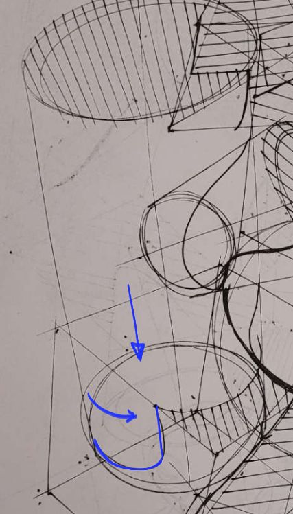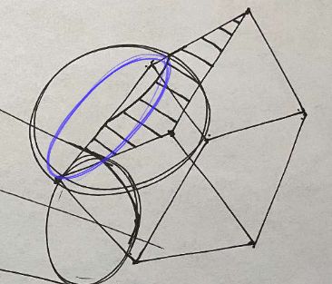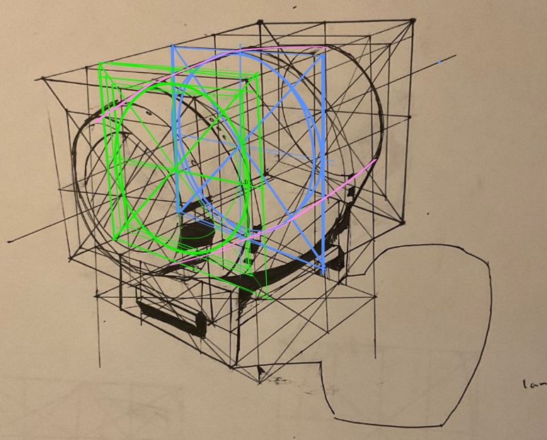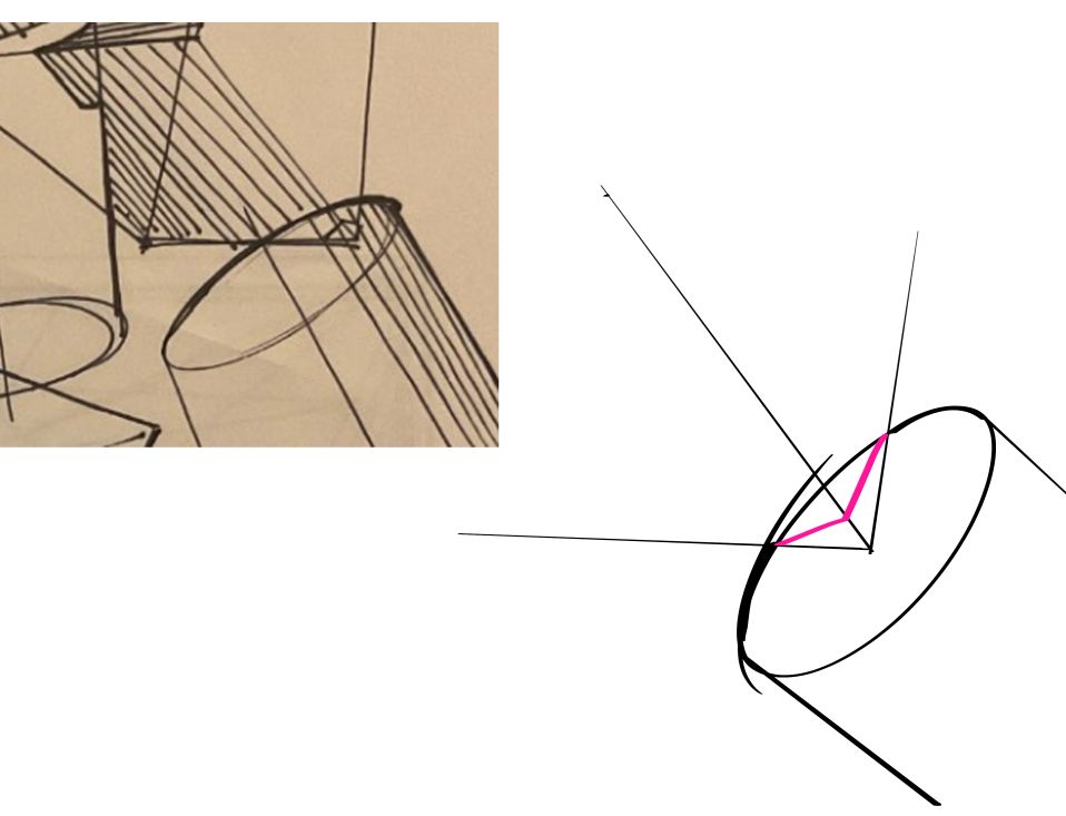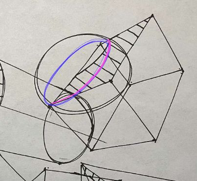 I am just going to point out a few places where we could improve on. When it comes to form intersections, I like to think about the "principle contours" that describe a surface. The simplest one, funny enough, is the sphere. It is simple because no matter the orientation or the path you take around a sphere, you are on an ellipse. So let's take this intersection and look closer at it. The principle contour of the sphere is an ellipse. I determined its degree by trying to imagine the degree of the ellipse that would fit into the top plane of the box, to keep the perspective in order. From here, the actual intersection is pretty straight forward.