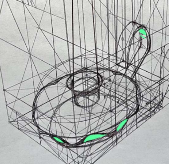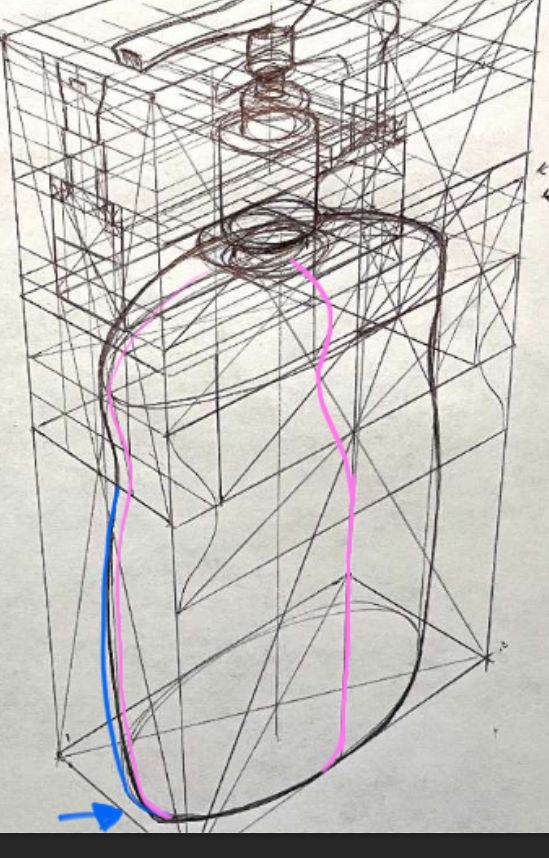 Another thing I would like to point out is when we use rulers, it offers more advantages than just straight lines. In this drawing of a spray bottle you have a lot of divergences in your perspective. Make sure to leverage your ruler to project your lines to check the perspective.