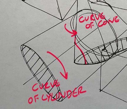 The same principle applies to this cylinder cone intersection, but a little more complex. The principle contour of the curved surface of the cylinder (and cone) are also ellipses, but they can be oriented a with a little more complexity as I show here. So what we must do is take liberties and design our world. I went with a basic ellipse and left it faint so you can see the subtle difference from yours. Additionally, we must take into account the curve of the cone which causes a subtle transition at the beginning/top of the intersection.