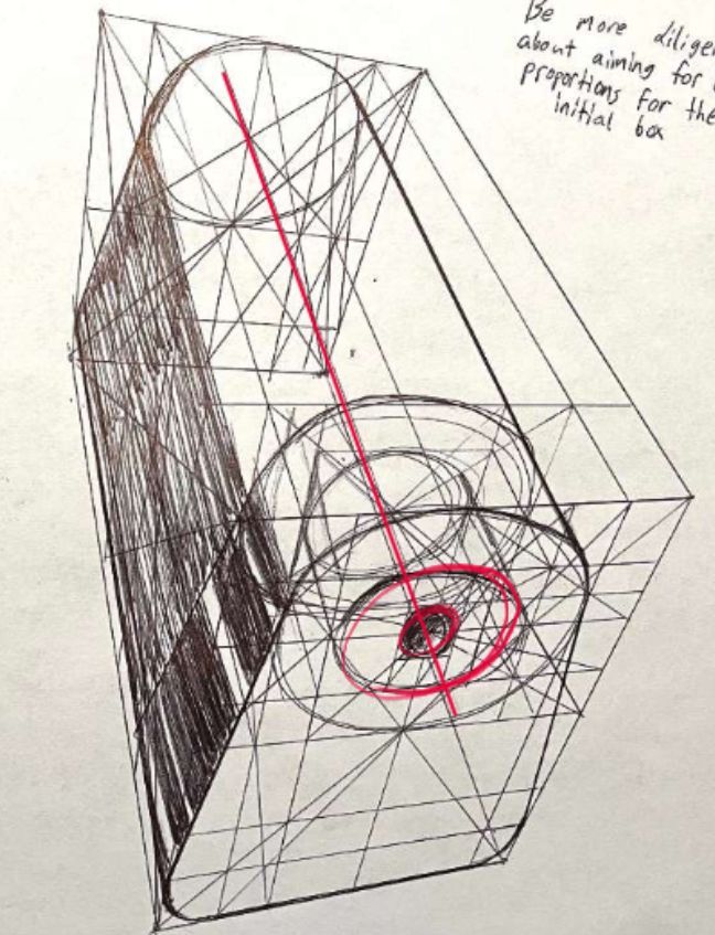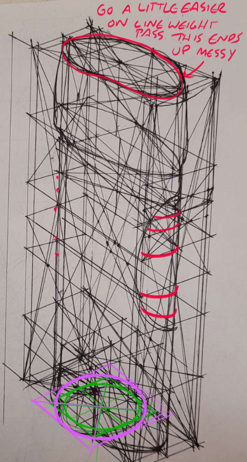 Barrel demo is hard because ellipses are hard. I drew over it here. Just remember to draw through all of your ellipses, and it really helps to bound them in planes (like I did in blue and green) then connect the ellipses at their extremes (pink/purple). In doing this, it also highlighted some extreme perspective issues. Remember that when you use a ruler you can use it to extend your lines to make sure your perspective is looking right. Overall though not bad.