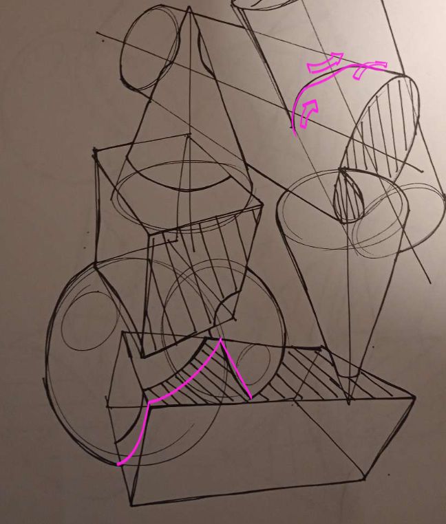 Starting with your form intersections you've done a pretty good job managing all of the complex information thrown at you. Before getting into any of the actual intersection stuff, I wanted to take a second to remind you about why we use hatching. It looks like you've gone into the realm of form shading on some areas like here and here to just name a few. We are not trying to convey form through any shading in drawabox, the hatching is used to communicate to ourselves and the viewers things like which plane of a form is facing us, etc. That being said, I'm not seeing much to point out here in your work. I can find a few corrections just so you feel like you're getting your money's worth: this cylinder box intersection - in my opinion the cylinder would be wrapping itself around the corner of the box as I drew in pink. For this cone-sphere intersection, I drew out the wrapping directions of the surfaces - cone, sphere, back to cone. It would result in a minor change, looking like this. This reduces that sharp curve to more naturally follow the sphere's surface as well as wrapping back around the cone at the end. Overall though, you're doing great and I think the compound curves etc. that you will deal with in lesson 7 will be a nice way to continue your growth and understanding of complex 3d space.