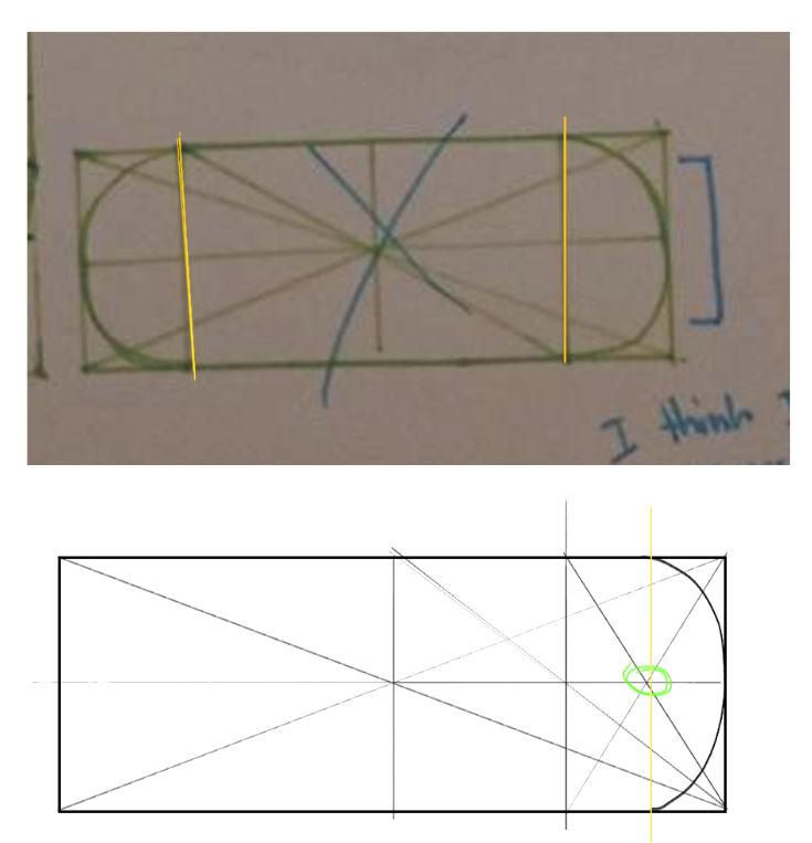 Looking at your bottle, I noticed a few issues with your orthographic studies. Looking at your bottom view here you kind of just marked down arbitrarily where the vertical lines should go. Something like this shouldn't be eyeballed while you're working through the lesson. You can see underneath your drawing I showed how I would locate that yellow line. I first split the right half of the box in half, then took that and divided it in half one more time. You can see that it's pretty darn close to where the yellow line is and that's where we can call it "good enough" for our purposes. It shows you're looking at proportions and using the subdivision methods. I also noticed that you seemed to have changed/omitted certain aspects of the top of the bottle like the top curvature, lid shape, and little handle. Make sure you sticking as close as you can to your references and not leaving things out if they seem hard.