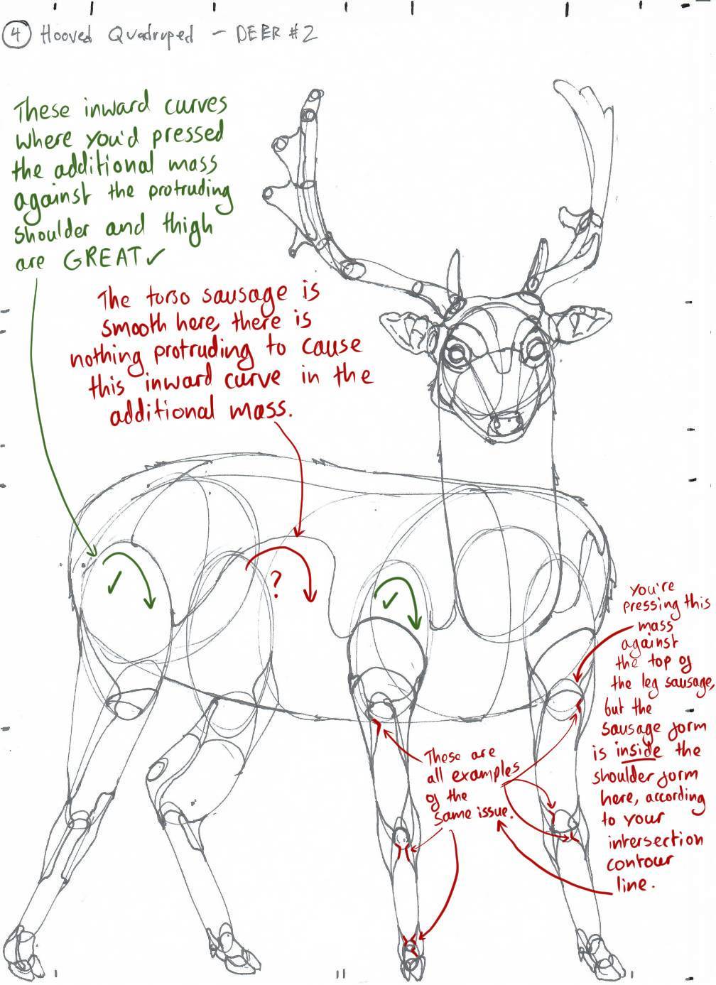 For the most part your additional masses demonstrate an excellent understanding of this logic, applying it to the forms at play and being mindful how they all relate to one another in space. I did spot a couple of things I’d like you to focus on, and I’ve marked them up with notes on this deer.