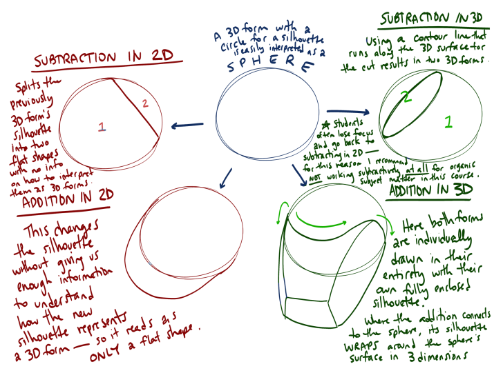 Sometimes the diagram I shared previously about what happens when we cut back inside the silhouette of a form we have already drawn doesn't click for people. I can also share this alternative diagram which shows examples of the various types of actions we can take when building a construction. When working on organic constructions within this course, strive to only take actions by adding in 3D as shown in the lower right of the diagram.