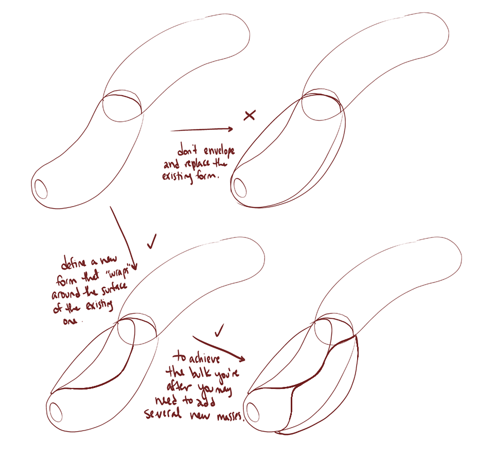 Instead, when we want to build on our construction or alter something we add new 3D forms to the existing structure. Forms with their own complete silhouettes - and by establishing how those forms either connect or relate to what's already present in our 3D scene. We can do this either by defining the intersection between them with contour lines (like in lesson 2's form intersections exercise), or by wrapping the silhouette of the new form around the existing structure as shown here.