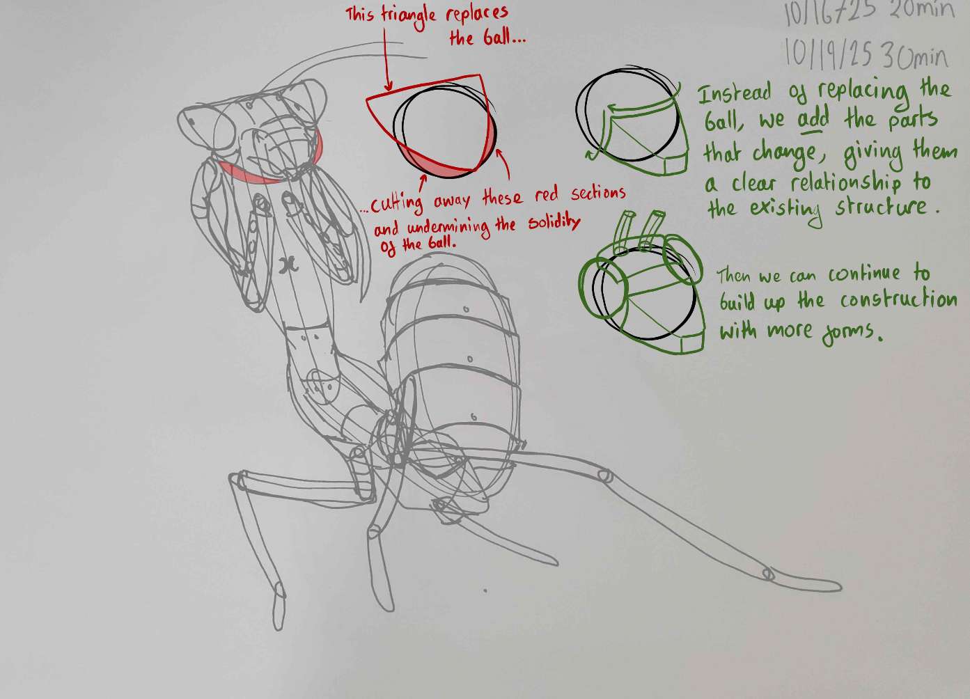 I did notice with the mantis that it looks like you’d started off the head with an ellipse, representing a ball-like form, but then decided to replace it with a triangle. As I’ve called out in these notes on your work this resulted in cutting back inside the silhouette of the ball form you’d already drawn, undermining its solidity. Instead, as I’ve shown in those diagrams, we can build up the pointed front of the head by attaching a new form to the ball, which creates a clearer 3D relationship between these two elements, reinforcing the illusion that we’re looking at something that exists in 3D space.