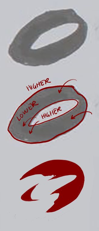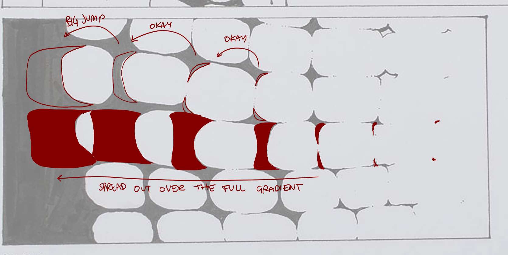 Now one issue I did notice is that you appear to be dictating the direction of your cast shadows based on your reference, which is incorrect. The only thing that the reference dictates is the nature of, and general arrangement of, the forms that make up the texture. Everything else including the position of the light source - and within reason, even aspects to how the forms are arranged - is in your control. The gradient itself is meant to be arranged such that the light source is on the far right as discussed here.