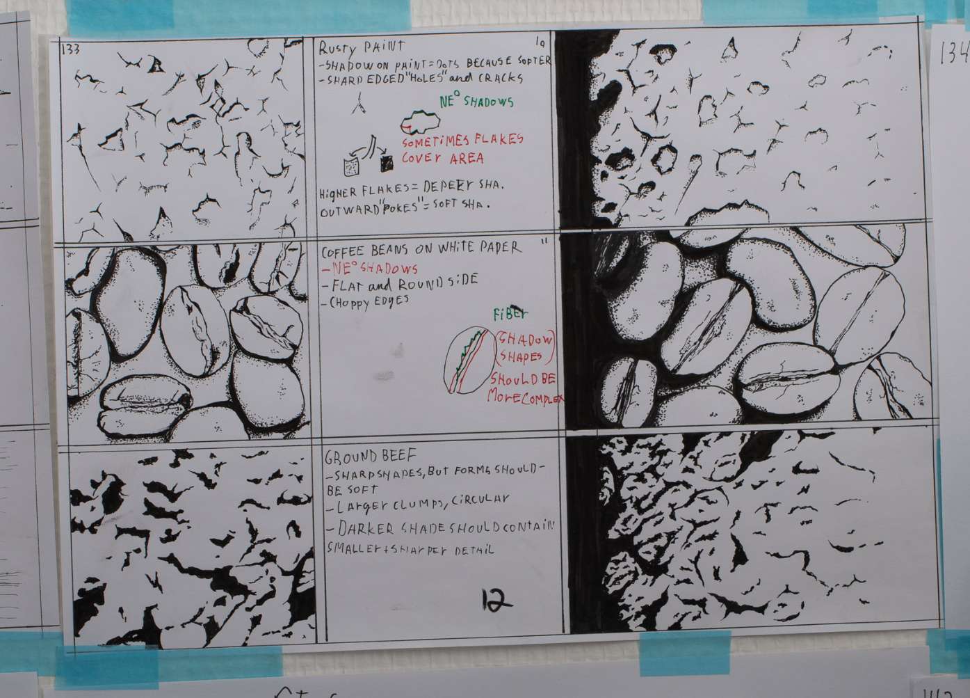 Another way in which you visibly improved over the course of the challenge was in shifting more and more away from thinking of your textural forms as being distinct (similarly to how with the coffee beans on this page even to the far right you needed to outline each coffee bean in its entirety), shifting instead to thinking of all of the forms as essentially being structures along the same surface. This is something we can lean into more easily with textures like the ground beef on the same page, since there aren't distinct objects that your brain is going to feel compelled to outline distinctly - but as we get further into the set, with the corn and scales towards the end you've started applying the same kind of thinking from the ground beef to textures that would be more prone to being viewed as distinct items. All of which is to say, you've definitely broken down that need to approach everything with explicit markmaking, and so the way in which you think about these textures has developed well towards engaging with them more through implicit markmaking.