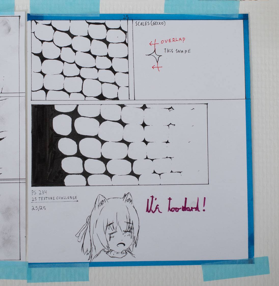The last thing I wanted to briefly discuss is the gradient for your last texture, the scales on this page. Overall this is definitely well done, but the jump to solid black on the far left is a little abrupt, since we're jumping from relatively small shadows to a huge one right at the end. Instead, having the cast shadow increase gradually over the whole thing is going to give you a far better result as shown here.