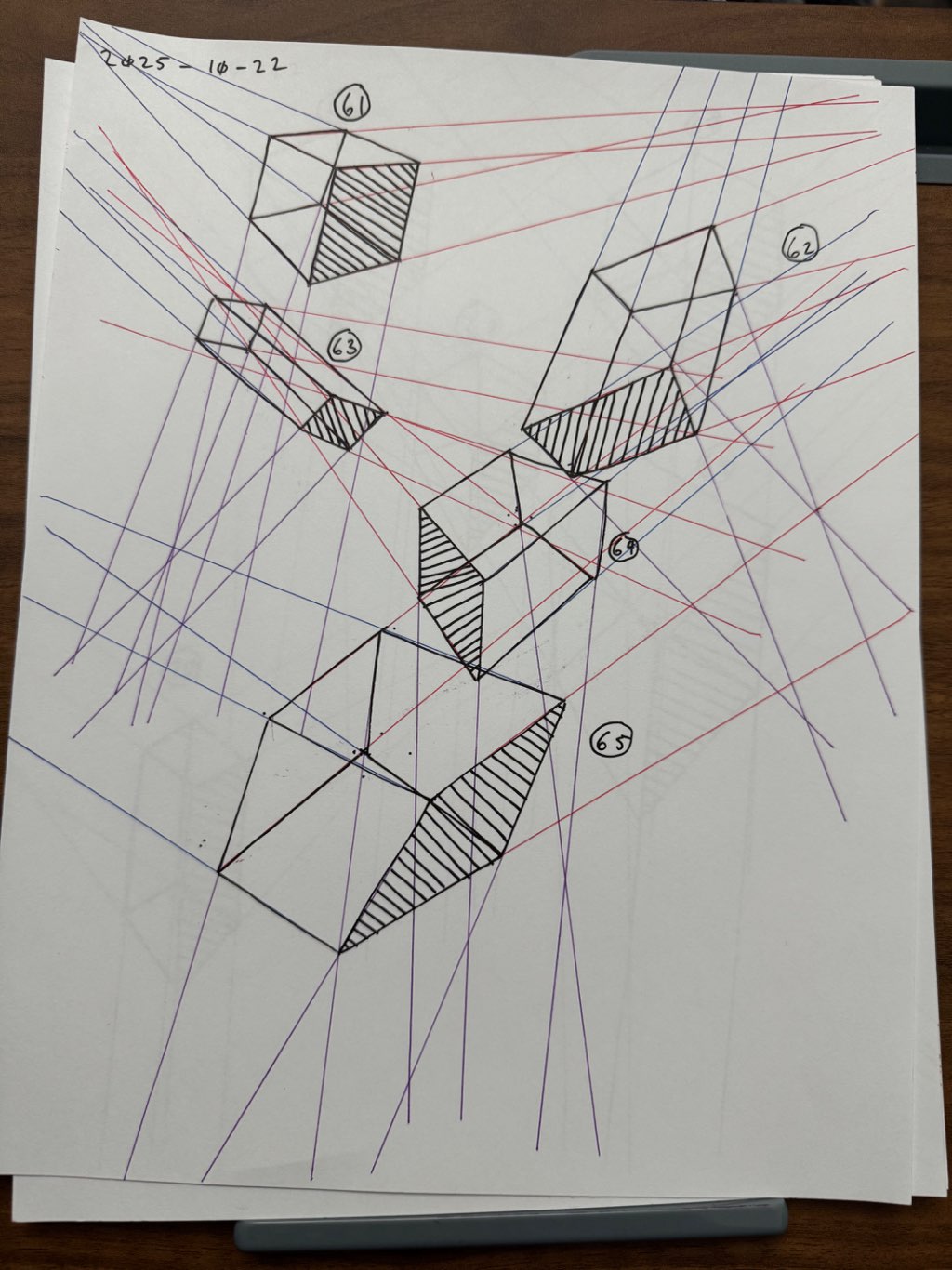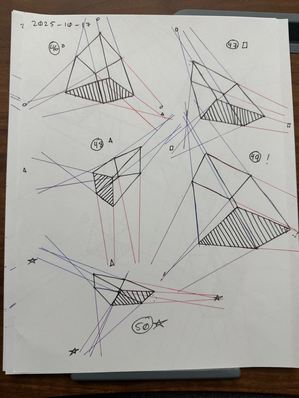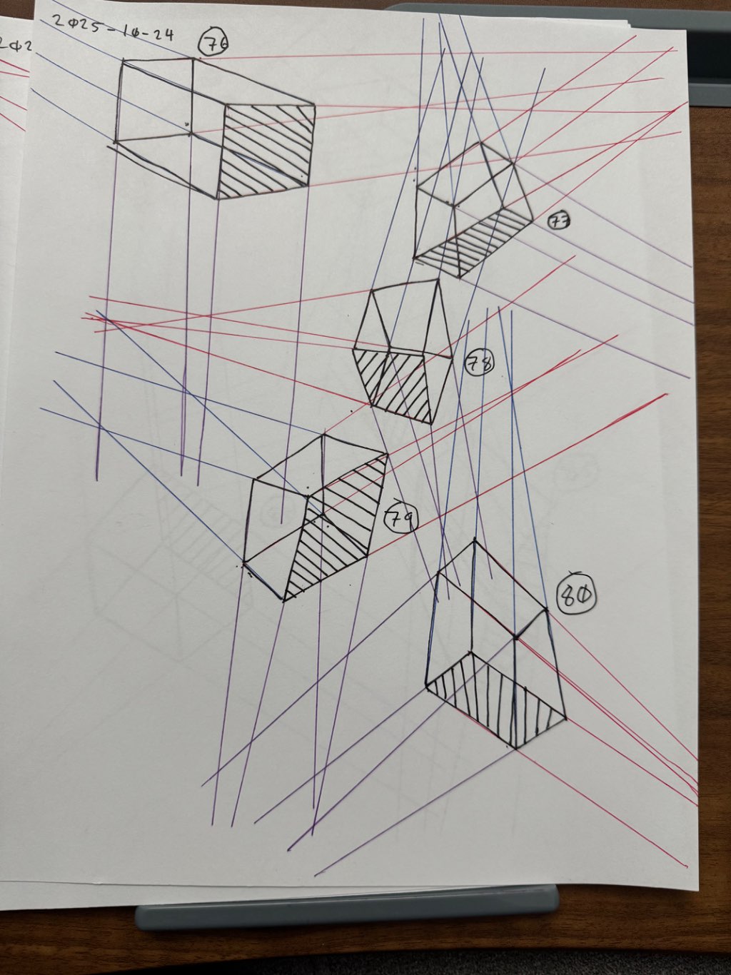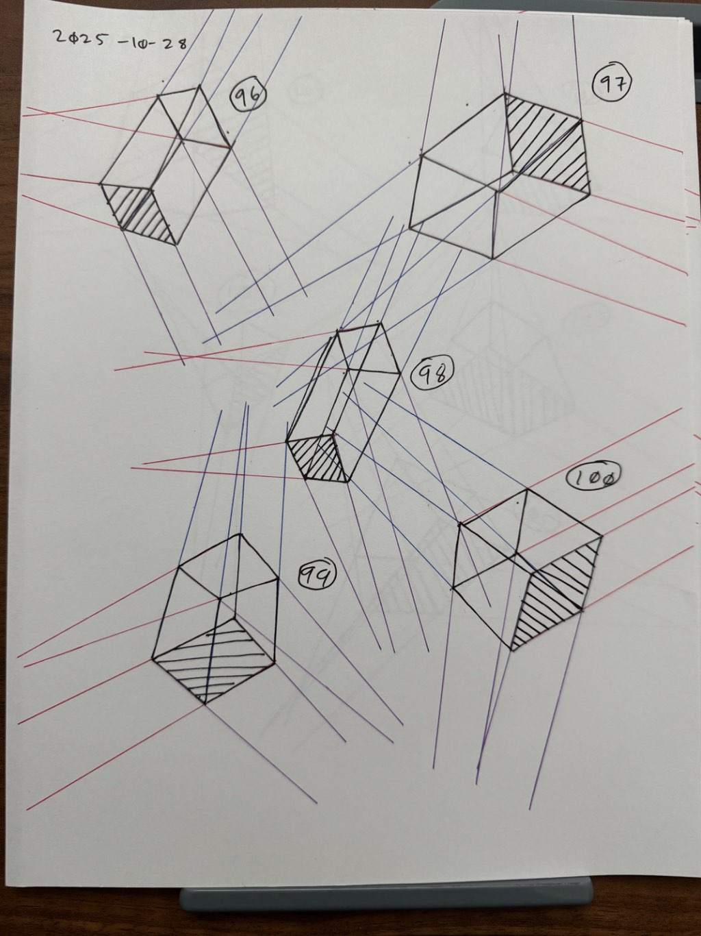 For the first 50, your lines are clean overall, though there was some wobbling throughout the set. Your convergences also show good accuracy, though I did see some lines pair off and converge towards two vanishing points, like box 6's red lines, box 26's blue lines, and box 48's purple lines.