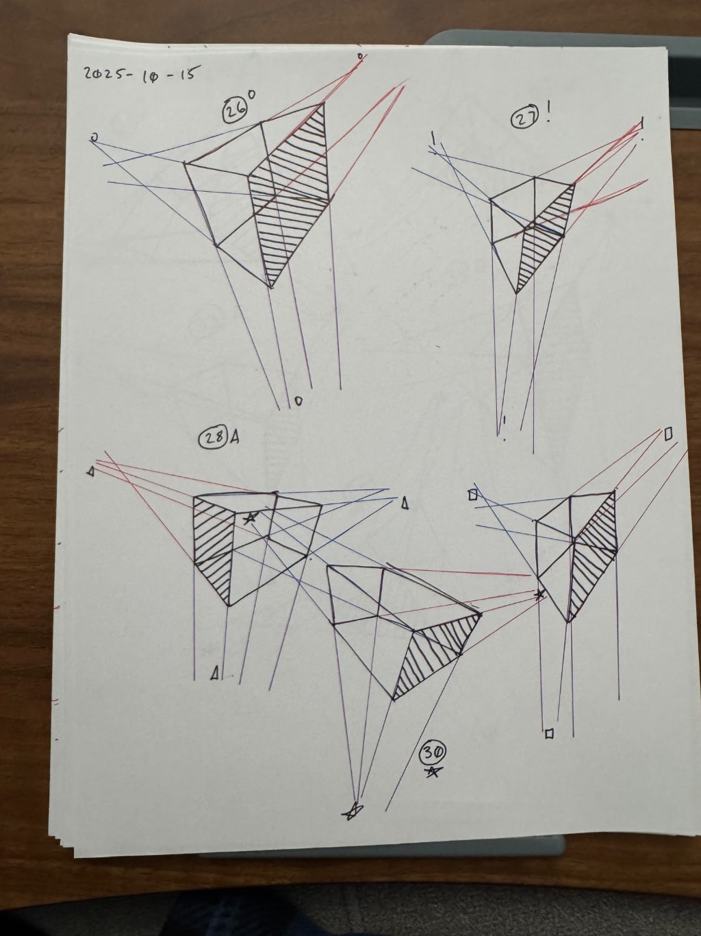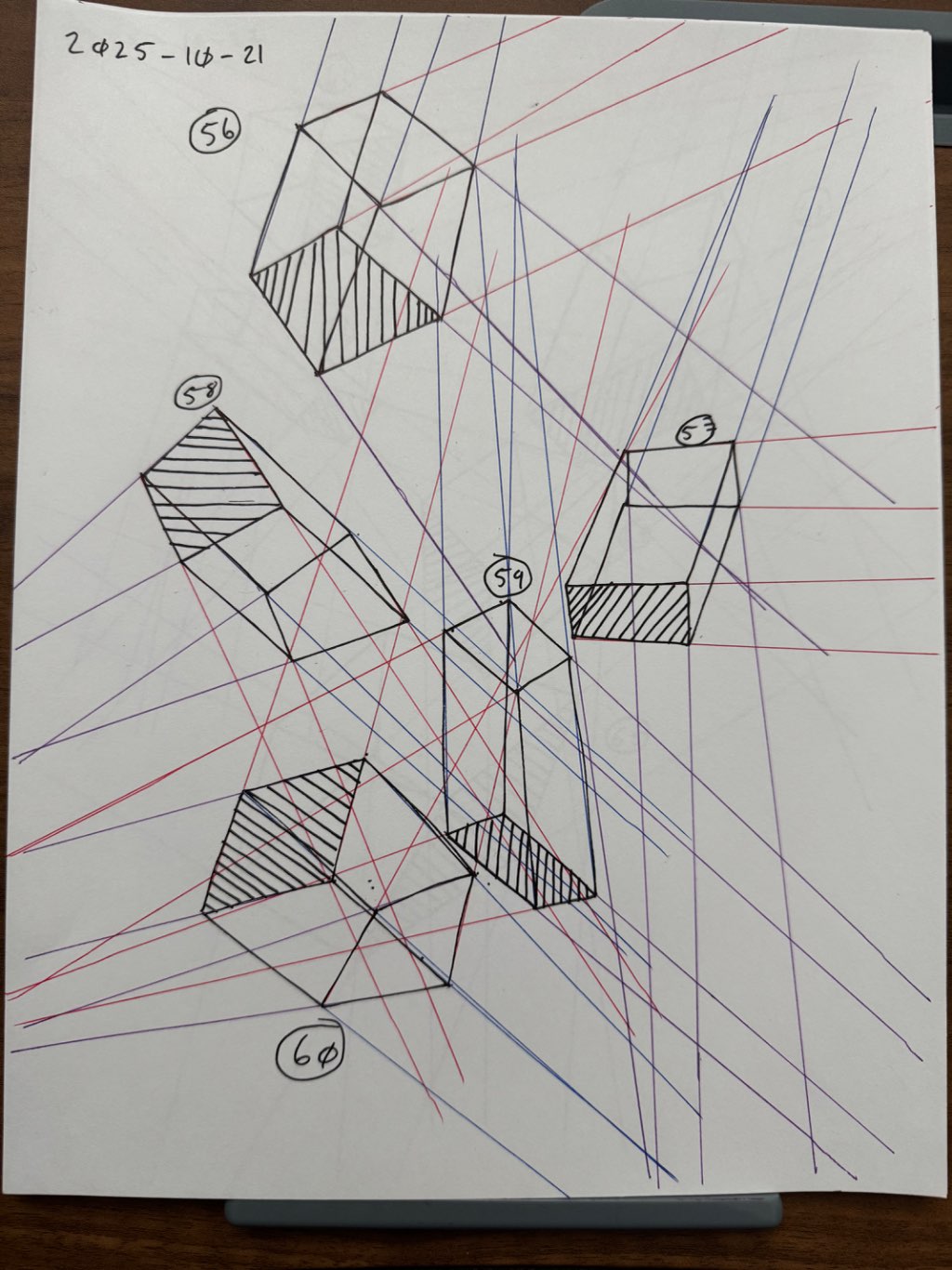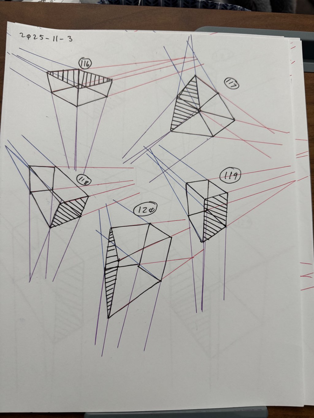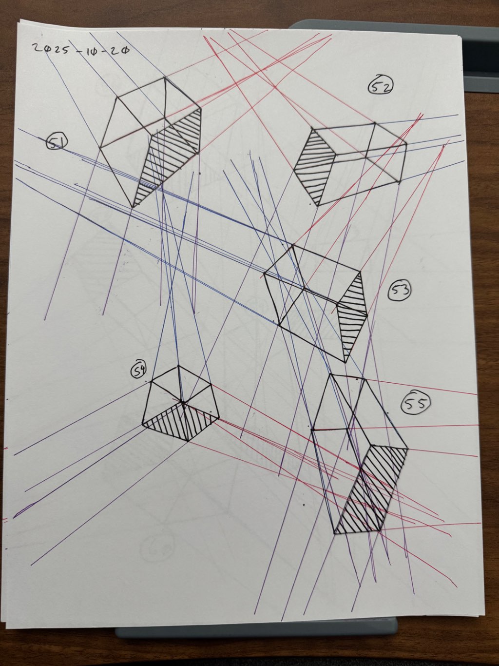 For the first 50, your lines are clean overall, though there was some wobbling throughout the set. Your convergences also show good accuracy, though I did see some lines pair off and converge towards two vanishing points, like box 6's red lines, box 26's blue lines, and box 48's purple lines.