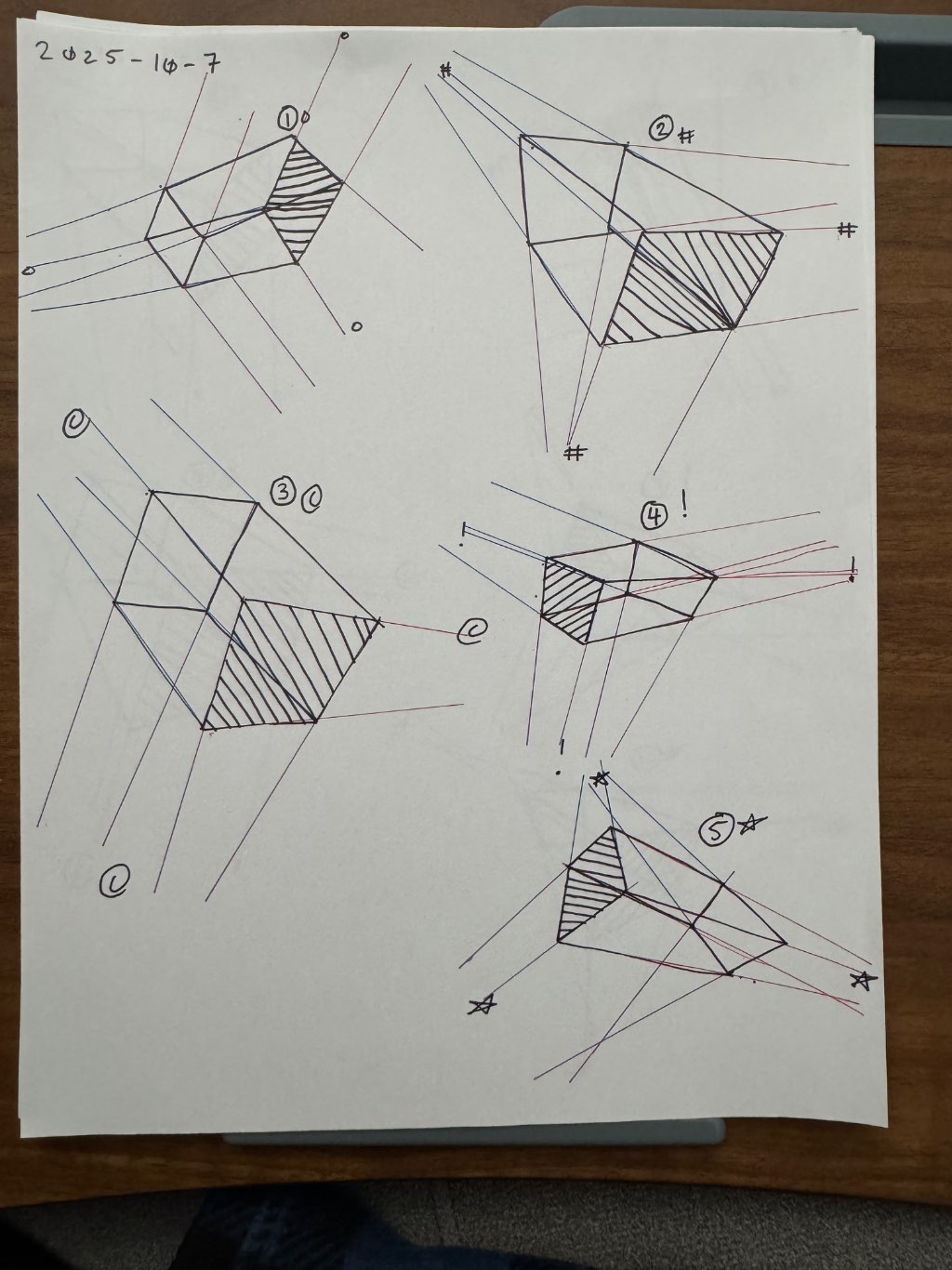 For the last 150, your lines continue to improve, with very little wobbling by the end of the set, showing very good technique and consistency. Your convergences also continue to improve, though there are still instances of lines pairing off, like in box 117's red lines, box 175's blue lines, and box 238's red lines. In these boxes, the inner lines (green and orange in this diagram) diverge instead of converging at the vanishing point. Keeping in mind the angles of neighboring lines can help when planning the box's construction.