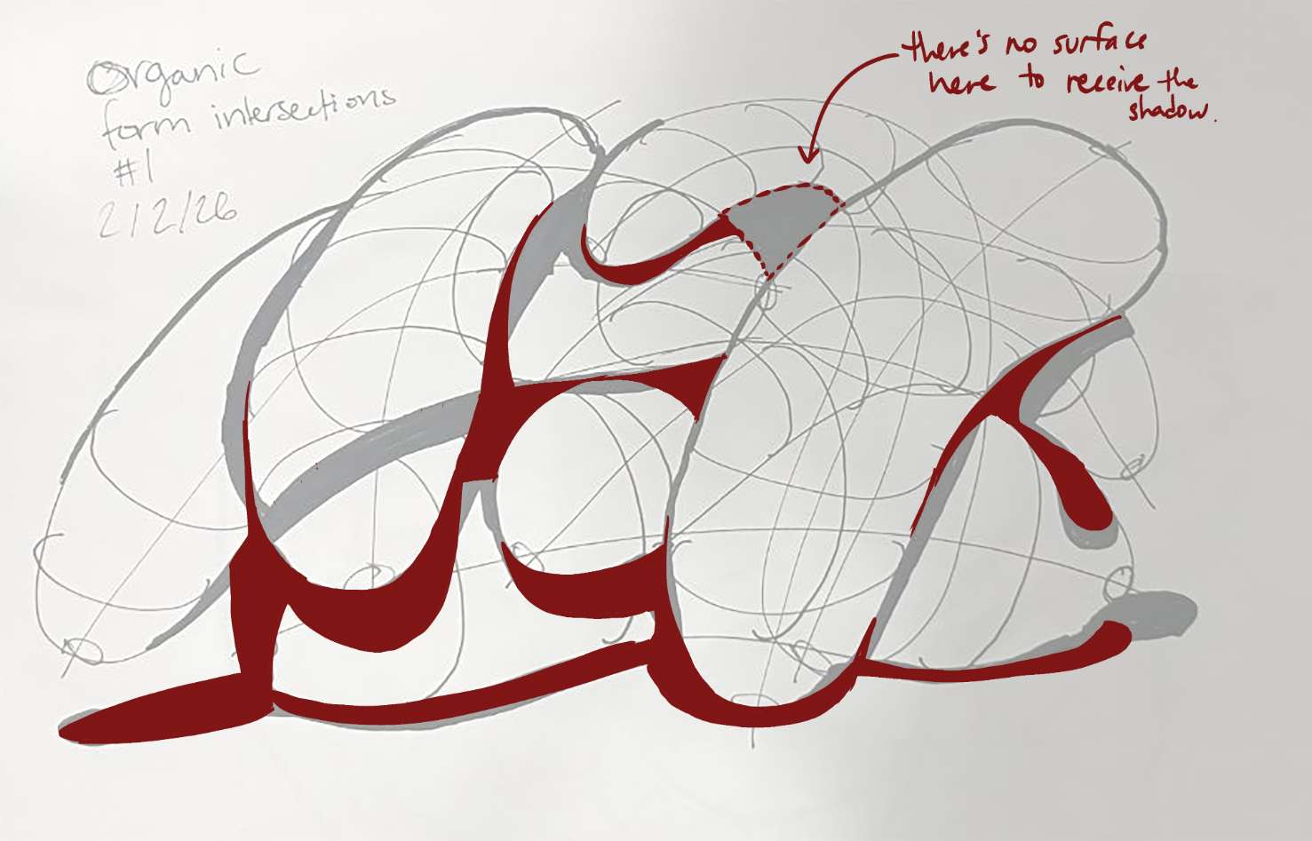 Lastly, the way you're drawing the sausages in your organic intersections does show that you're thinking about how these forms drape over one another in 3D space, although your use of cast shadows (or more specifically, the tendency to conflate cast shadows with line weight and blend them together) is running into some issues. First and foremost, keep in mind that cast shadows and line weight are fundamentally different tools. Cast shadows can be very large but they have to be cast upon an existing surface (and therefore doesn't just arbitrarily stick to the silhouette of the form casting it), and the specific shape they take corresponds to the relationship in 3D space between the form casting it and the surface receiving it. Line weight on the other hand should be kept very subtle and focused on the specific localized areas where overlaps between lines need additional clarification (per what's discussed here in Lesson 1. I also noticed that here you seem to have drawn a cast shadow before finishing adding all of your sausages, resulting in another form being dropped on top of it, with its own cast shadow, resulting in a visual inconsistency that makes it impossible for the viewer to determine which one is on top.