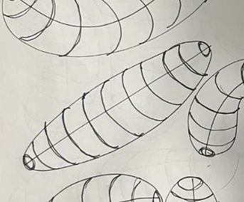 For your sausages with contour lines, you've done a much better job of drawing your contour curves, choosing to execute each mark with a single stroke instead of multiple. Two things to keep in mind going forward: