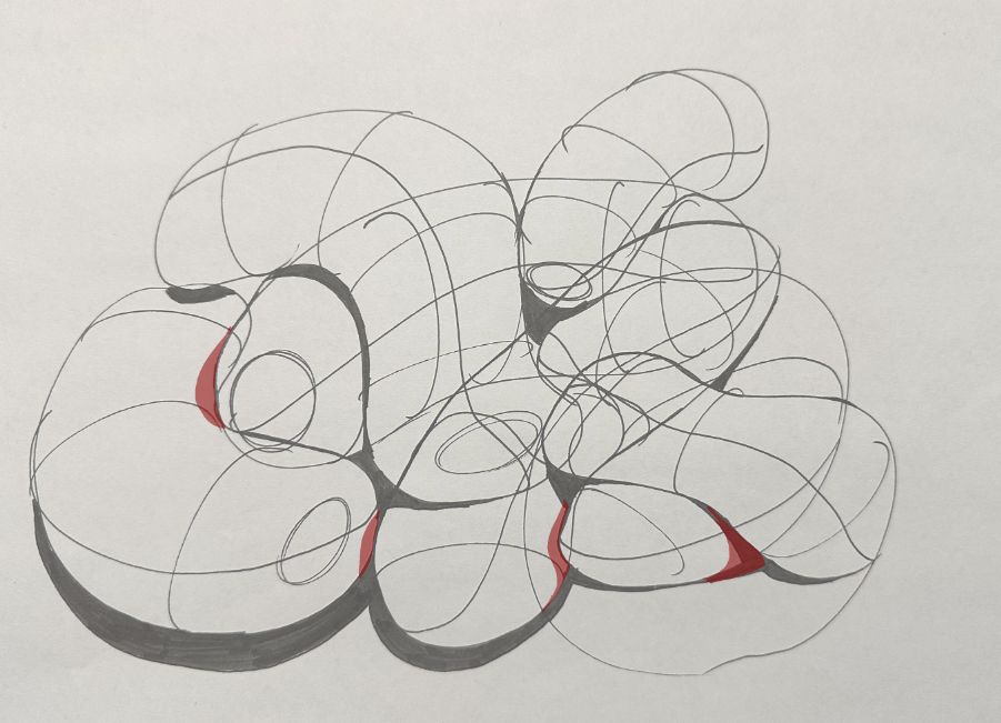 Anyway, lastly, your organic intersections demonstrate that you're clearly thinking about how these forms slump and sag under the influence of gravity, and you're leveraging your cast shadows to emphasize this to great effect. If I had to nitpick, one thing you can continue to work on is ensuring that every form is considered in terms of what kind of shadow it would be casting, and in which direction. As we see here, your light source seems to be coming more from the right side, but there were a number of forms that didn't quite project shadows where they certainly could. Also, for the shadow furthest to the right, I added a little more to follow the curvature of the sausage it was cast upon.