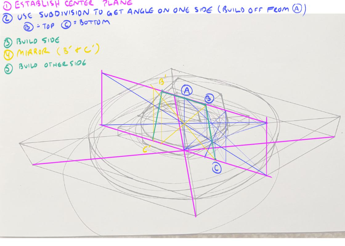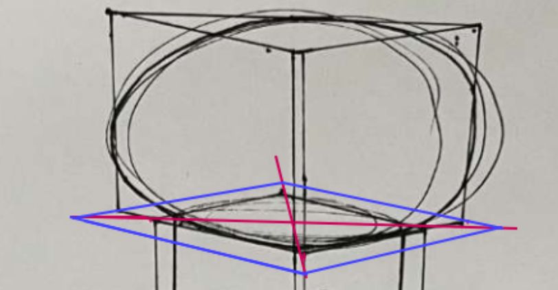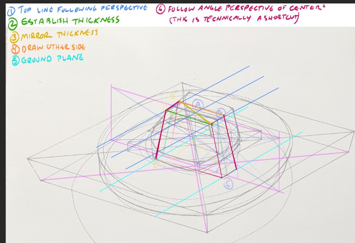 The pot lid had some troubles with the lid, and in the absence of knowing exact perspective etc from an orthographic study I am showing how to build it out with my own proportions (still using subdivision method). I start with a build of the middle plane and then for demo purposes I need to lower the opacity to show how to build it out front and back I simplified a few things, like just having lid+handle and omitting the platform the handle is on, but this should show you how to think about this stuff. You can see how yours ended up pretty off center by not first establishing center planes and not using mirroring techniques. That's ok though, this is the first time many students have seen this way of drawing and it can take some time to get your brain to shift gears.