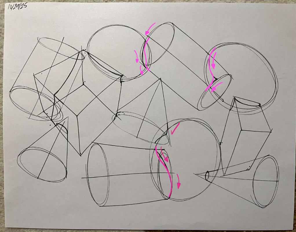 Starting with your form intersections you're showing a pretty good grasp on intersections involving two flat planes. I drew over some of your intersections here to clarify some curve-curve situations. The big thing here is just mileage and getting a feel for these situations, and you'll continue to get exposed to these in lesson 7 as we deal with vehicles which very commonly have these compound curves. You did pretty well with a lot of these situations but I still like to link this informal demo that Uncomfortable drew up to further illustrate the thinking process. I also drew up a cone sphere intersection because yours were so small we can't really catch the nuance. I tried to label how the curves follow on form then the other: the cone, then the sphere, back to cone, back to sphere, and finally along the cone again. You're on a great start here and you'll keep getting better with more practice.