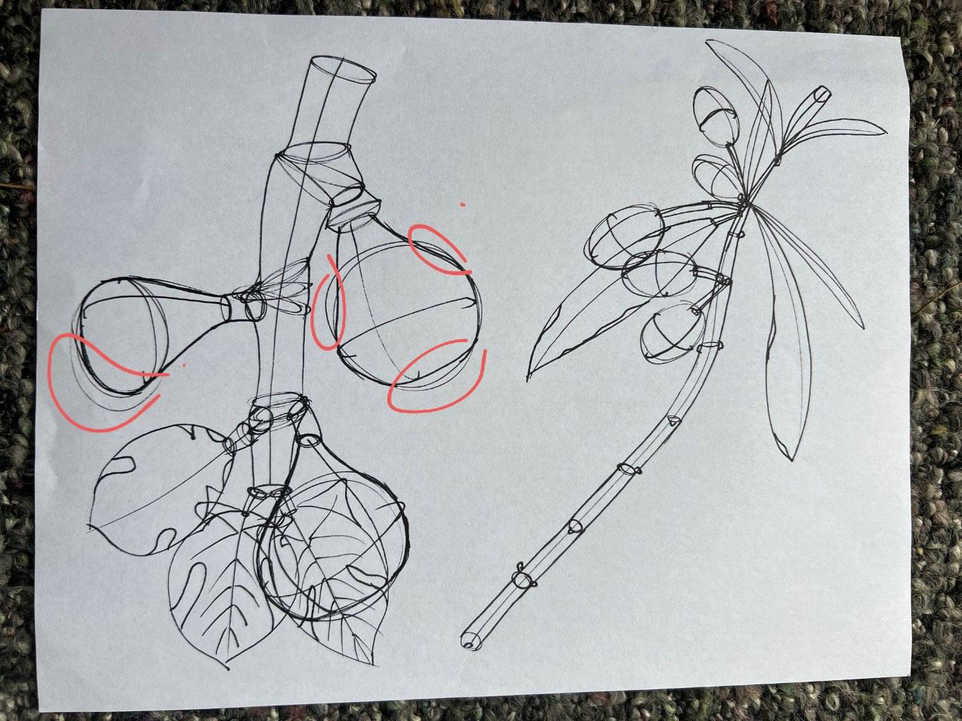And lastly let's take a look at your plant constructions, which are generally coming along well made, as you're following the construction methods and techniques introduced in the lesson which allows you to construct really solid looking and believably tridimensional structures. I can see a good developing sense of spatial reasoning in these pages.
