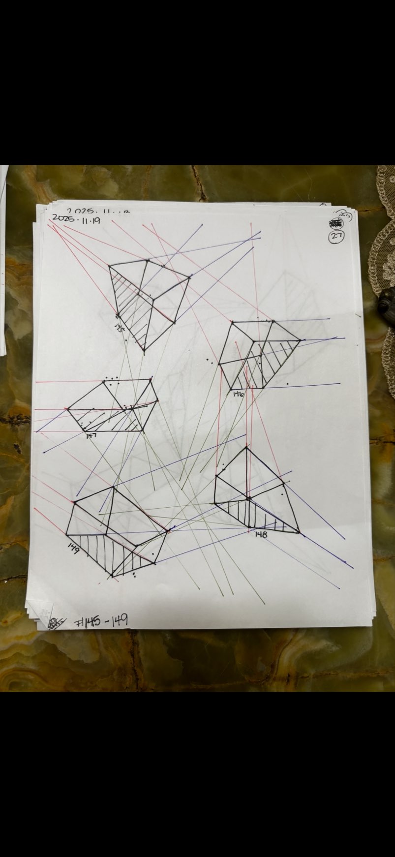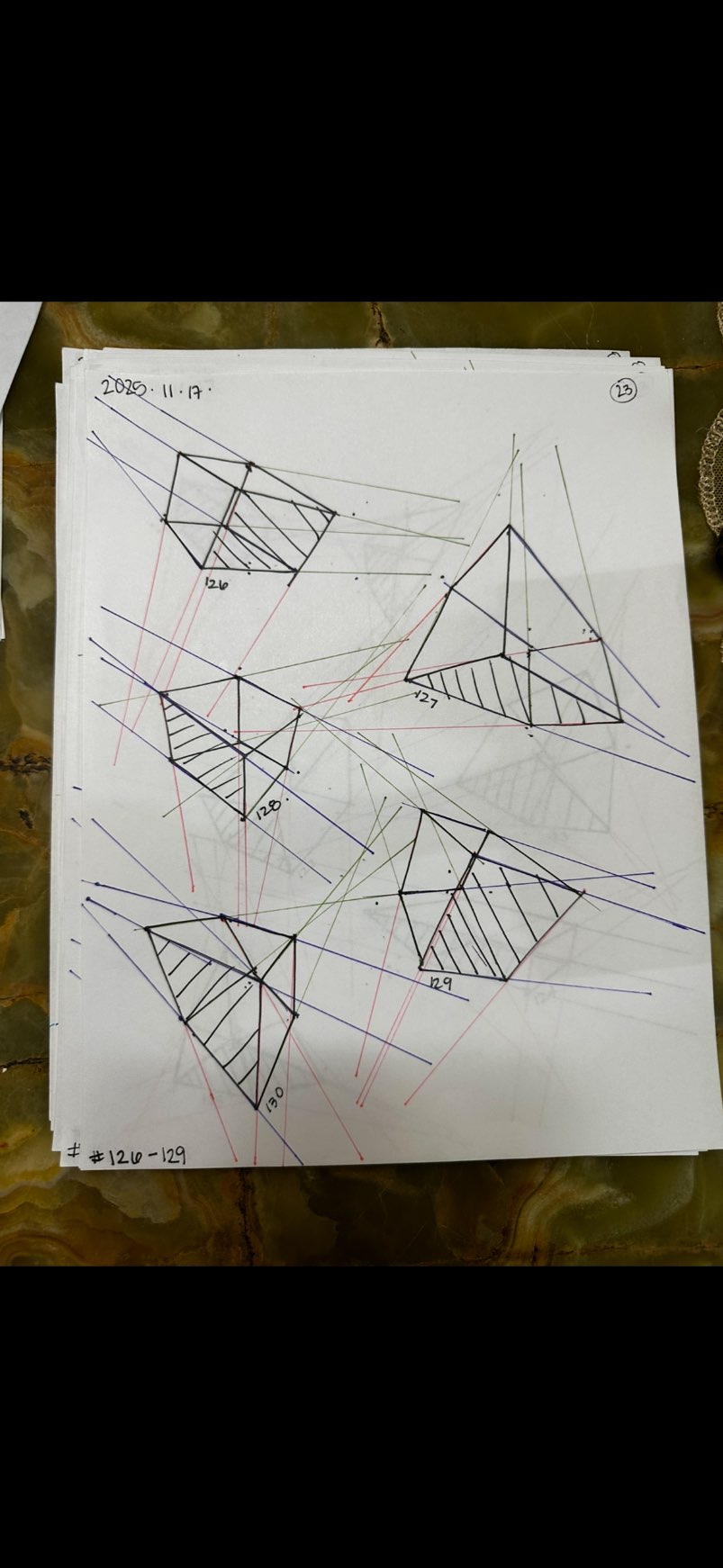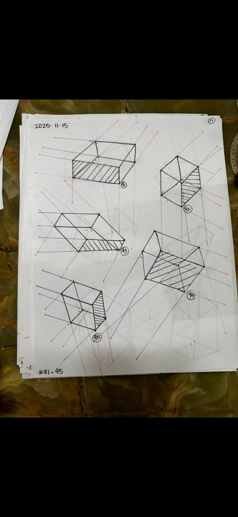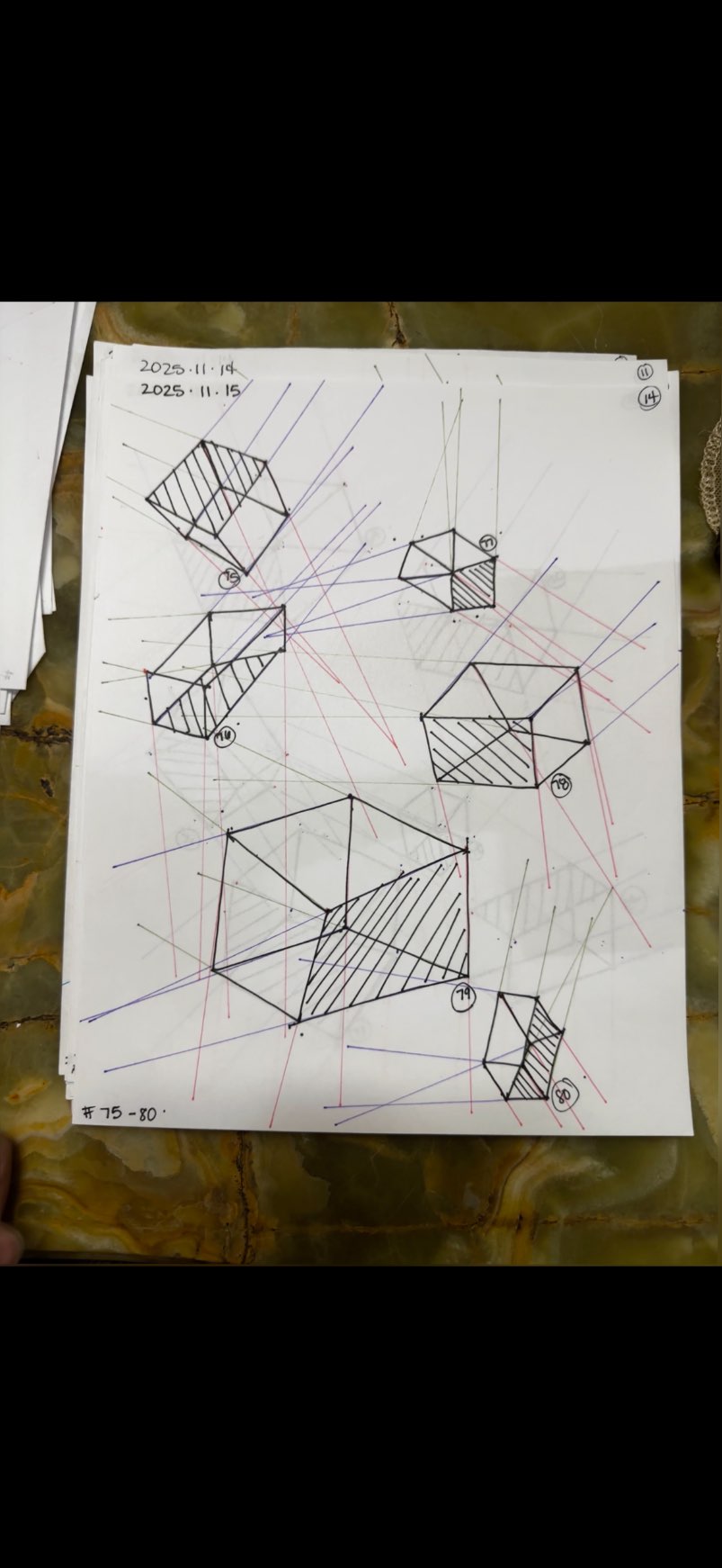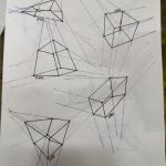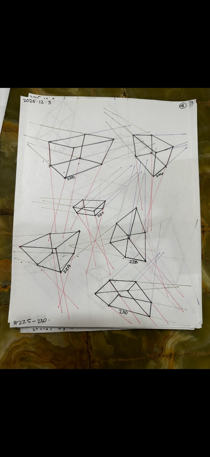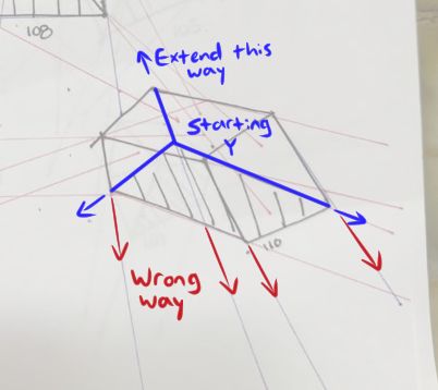 Your convergences also continue to improve, though there are still instances of lines pairing off, like in box 129's green lines, box 171's green lines, and box 227's red lines. In these boxes, the inner lines (green and orange in this diagram) diverge instead of converging at the vanishing point. Keeping in mind the angles of neighboring lines can help when planning the box's construction.