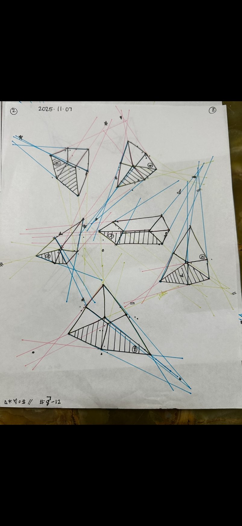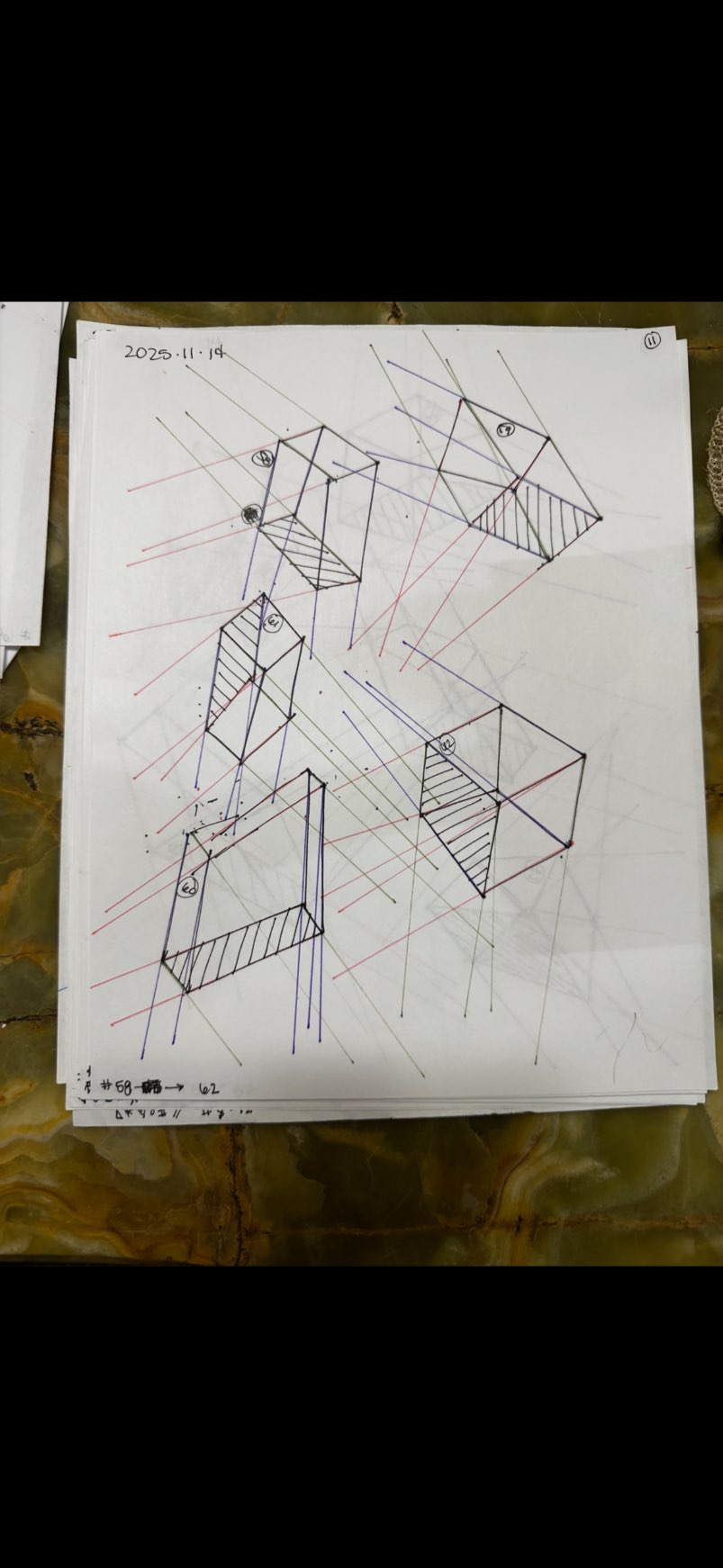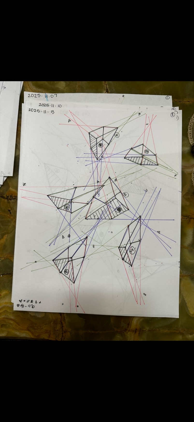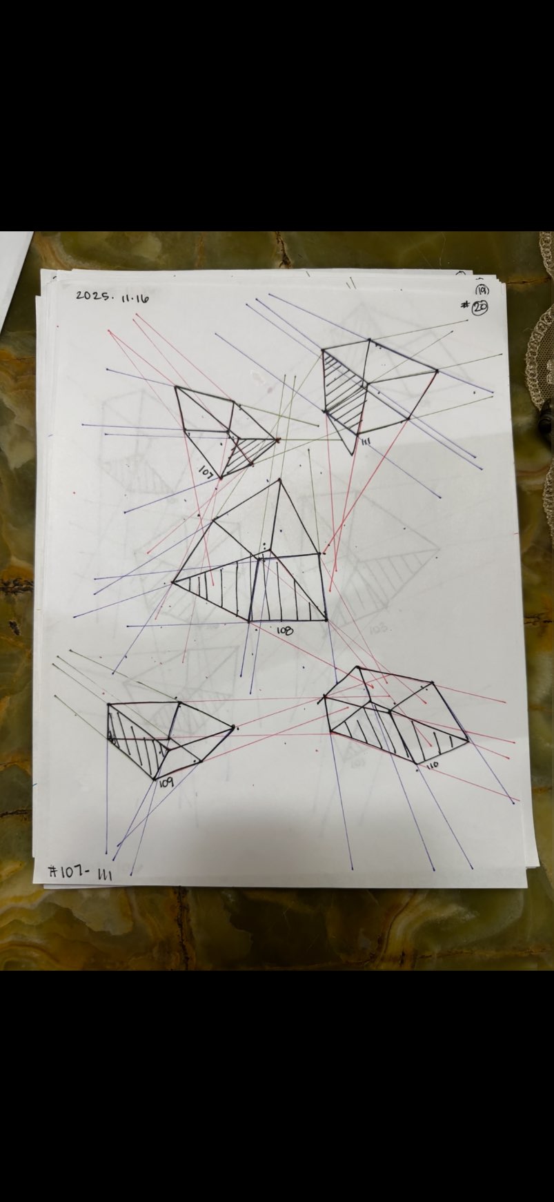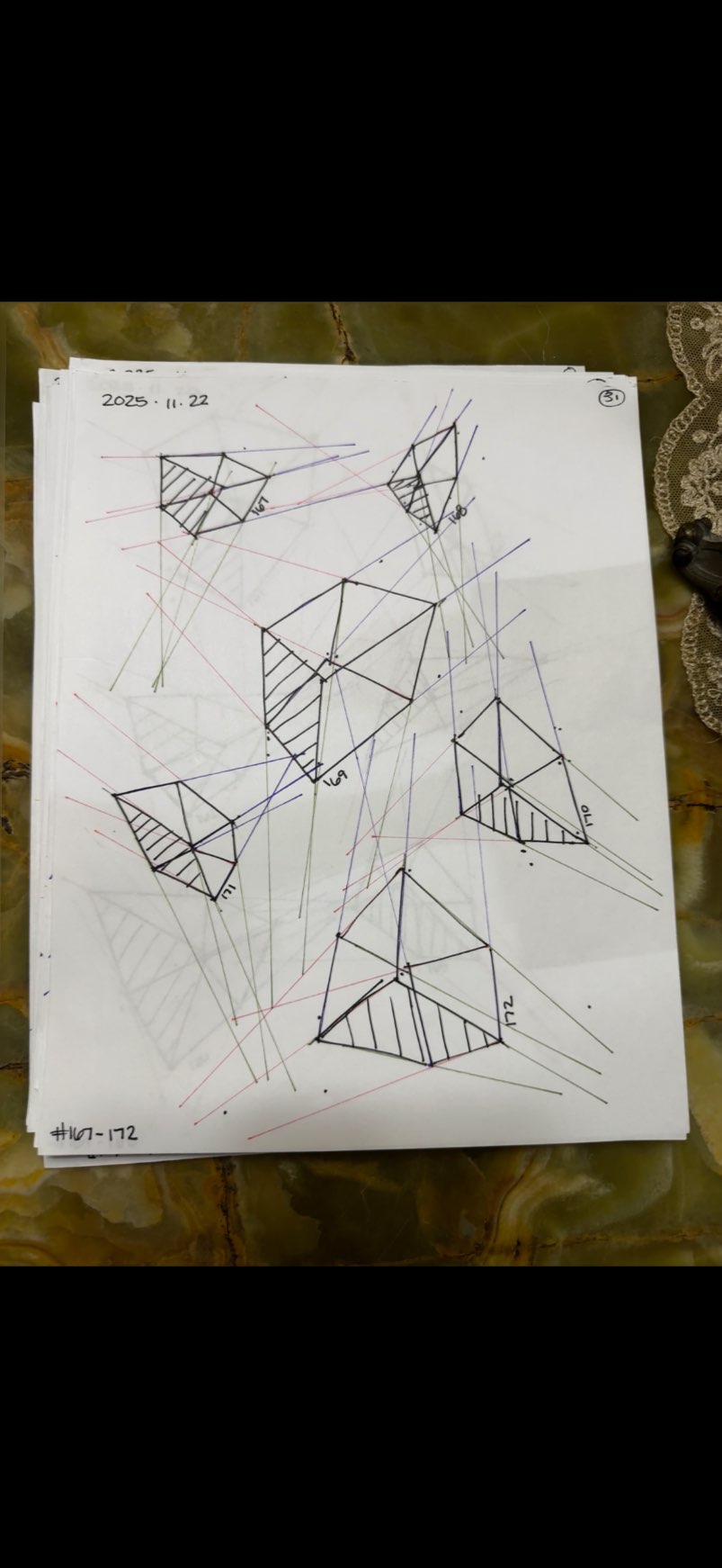 Your convergences also continue to improve, though there are still instances of lines pairing off, like in box 129's green lines, box 171's green lines, and box 227's red lines. In these boxes, the inner lines (green and orange in this diagram) diverge instead of converging at the vanishing point. Keeping in mind the angles of neighboring lines can help when planning the box's construction.