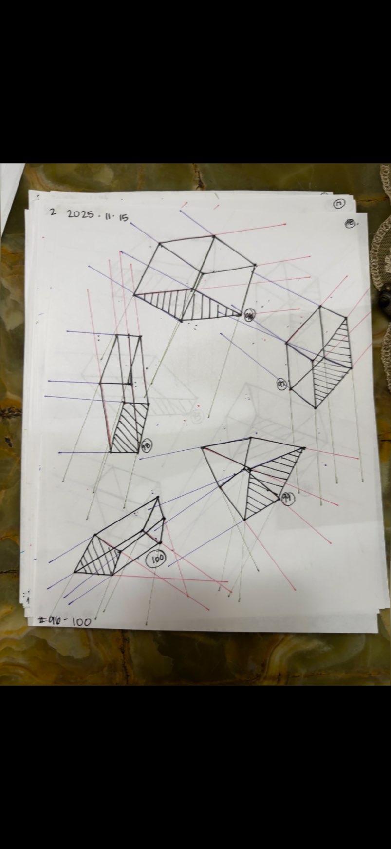 For the first 50, your lines are clean overall. However, I did see some wobbling throughout the set. Your convergences also show good accuracy, though I did see some lines pair off and converge towards two vanishing points, like box 8's red lines, box 22, and box 45's red lines.