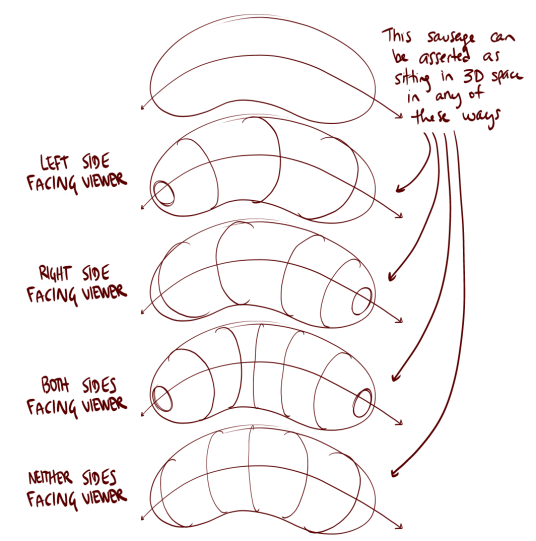When deciding which end(s) of a form to add contour ellipses to, remember that these ellipses are no different from the contour curves, in that they're all just contour lines running along the surface of the form. It's just that when the tip faces the viewer, we can see all the way around the surface, resulting in a full ellipse rather than just a partial curve. But where the end is pointing away from us, there would be no ellipse at all. Take a look at this breakdown of the different ways in which our contour lines can change the way in which the sausage is perceived - note how the contour curves and the ellipses are always consistent, giving the same impression of which ends are facing towards the viewer and which are facing away.