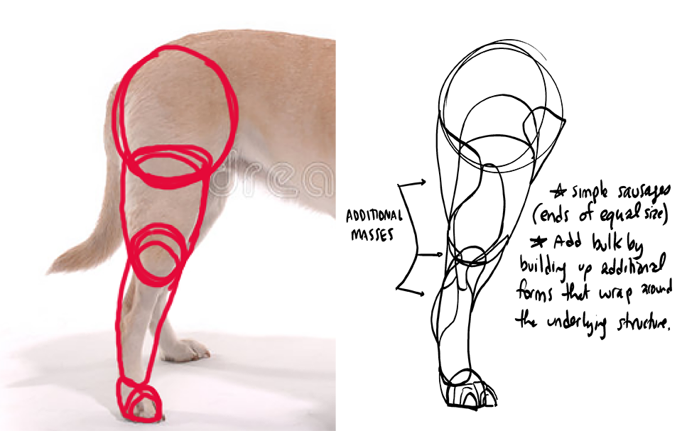 The key to keep in mind here is that the sausage method is not about capturing the legs precisely as they are- it is about laying in the base structure or armature that captures that captures both the solidity and gestural flow of the limb in equal measure, where the majority of other techniques lean too far to one side, either looking solid and stiff or gestural but flat. Once in place, we can then build on top of this base structure with more additional forms as shown in these examples here, and here. This tactic can be used extensively to build up the specific complexity of each particular leg, as shown in this ant leg demo. I'll also share this dog leg demo as an example of how to apply the sausage method to animal legs because the sausage method should be used throughout lesson 5.