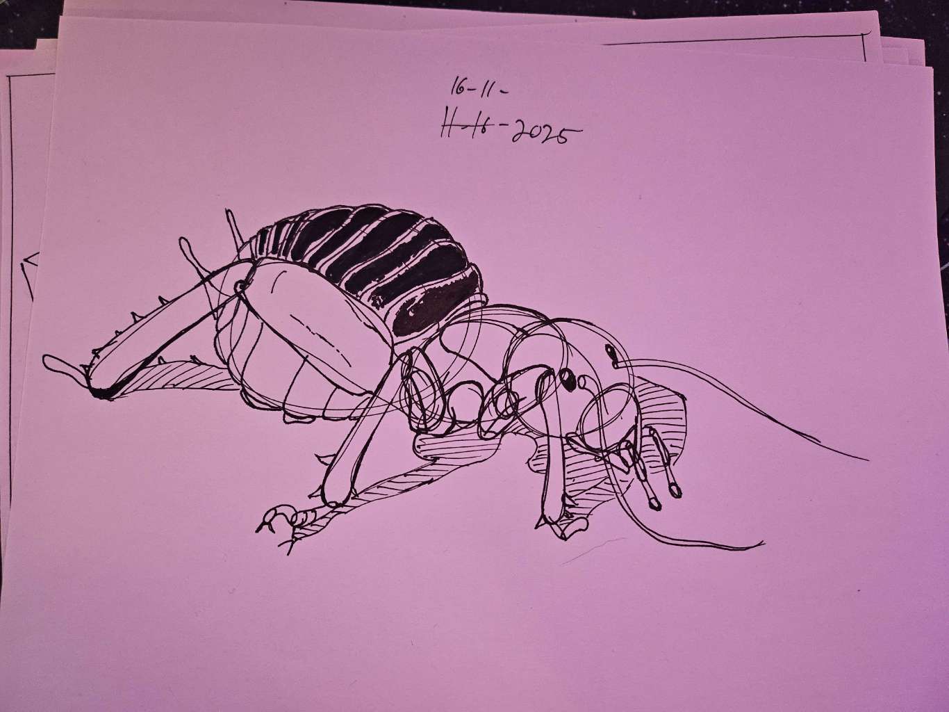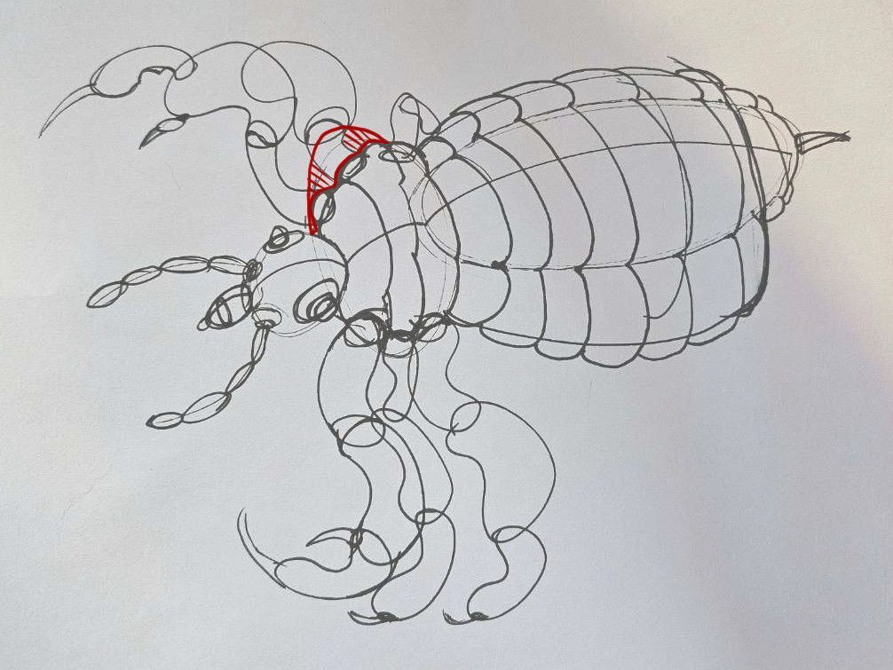 Fortunately you don’t appear to cut back inside the silhouettes of forms you have already drawn very often, although I have highlighted one example here on your louse with red hatching where it looks like you cut back inside the ball form you had established for the thorax.