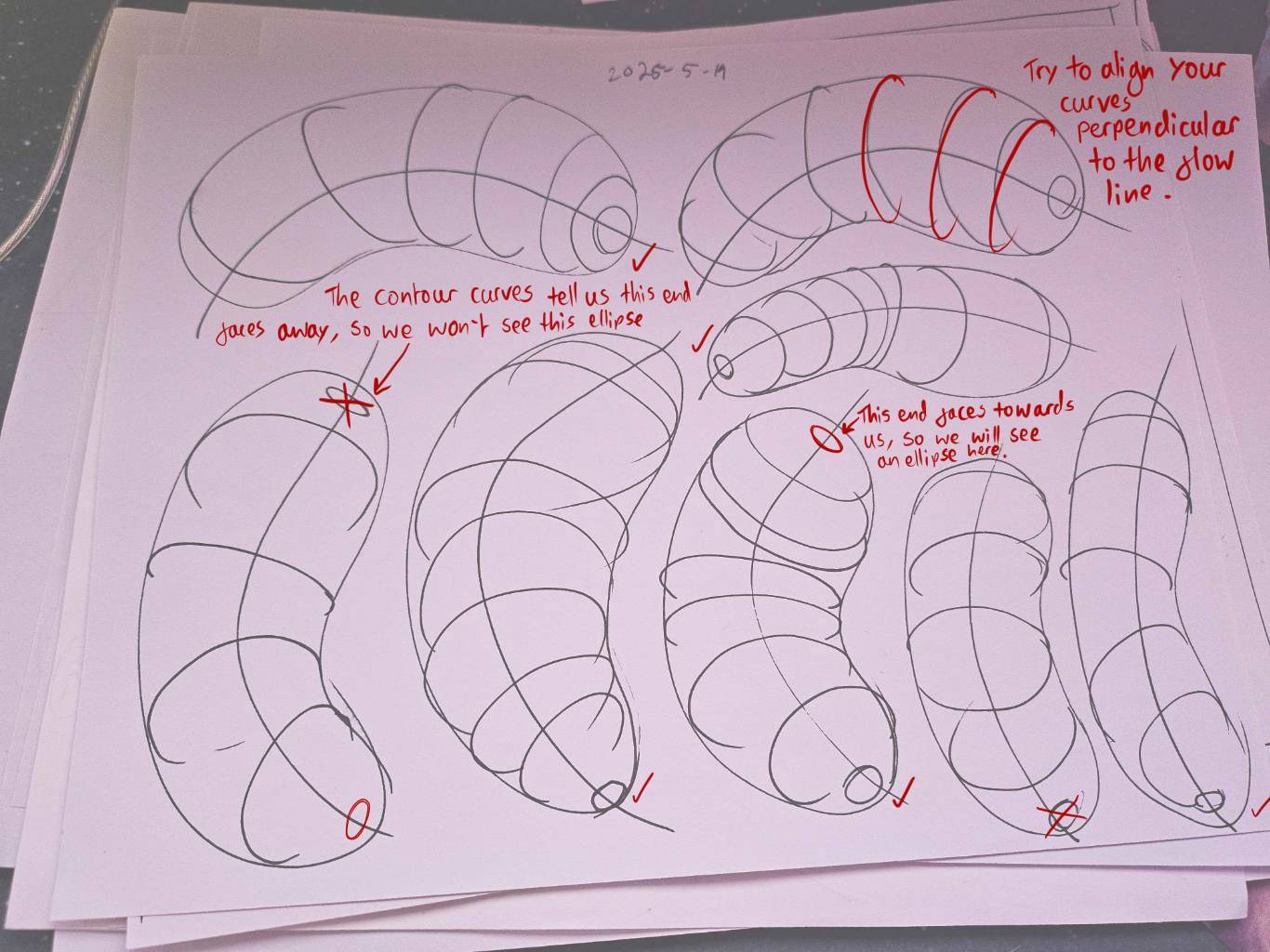 With regards to your contour curves, I can see that you’re striving to fit them snugly against the sides of the form and hooking them around so their curvature accelerates as they approach the edge, which is great. Keep pushing to align each curve so that they are perpendicular to the length of the form, using the central flow line as their minor axis. While this isn’t easy and we do expect to see the odd one that is a little off, when there are 3 in a row that are misaligned, (as I’ve called out on the upper right of this page) it does suggest you could be more consciously aware of this requirement. Remember to rotate your page to find the easiest angle to draw each curve, as part of the planning phase of the ghosting method.