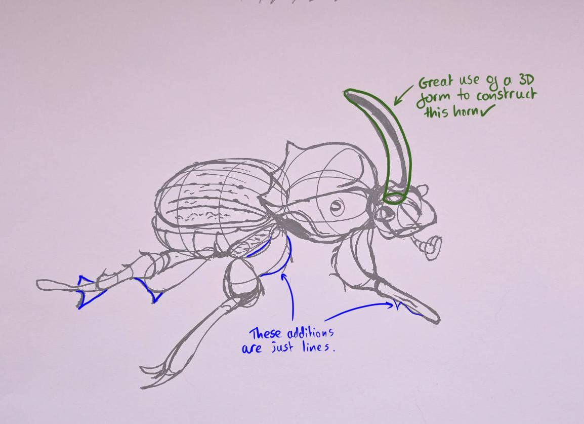 While cutting back into a silhouette is the easiest way to depict the issues with modifying a form after it's been drawn, there are other ways in which we can fall into this trap. On your beetle I also marked in blue some places where you'd extended off existing forms using partial, flat shapes, not quite providing enough information for us to understand how they actually connect to the existing structure in 3D space. While this approach worked fine for adding edge detail to leaves in the previous lesson, this is because leaves are paper-thin structures, so essentially they are already flat and altering their silhouette won’t flatten them further. When we want to build on forms that aren’t already flat we need to use another strategy.