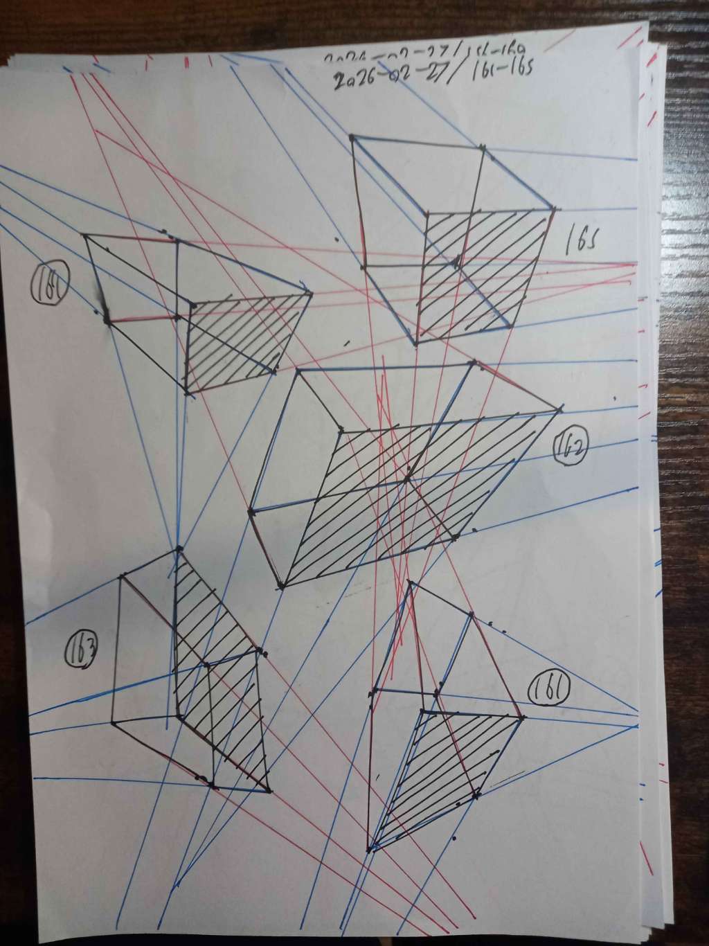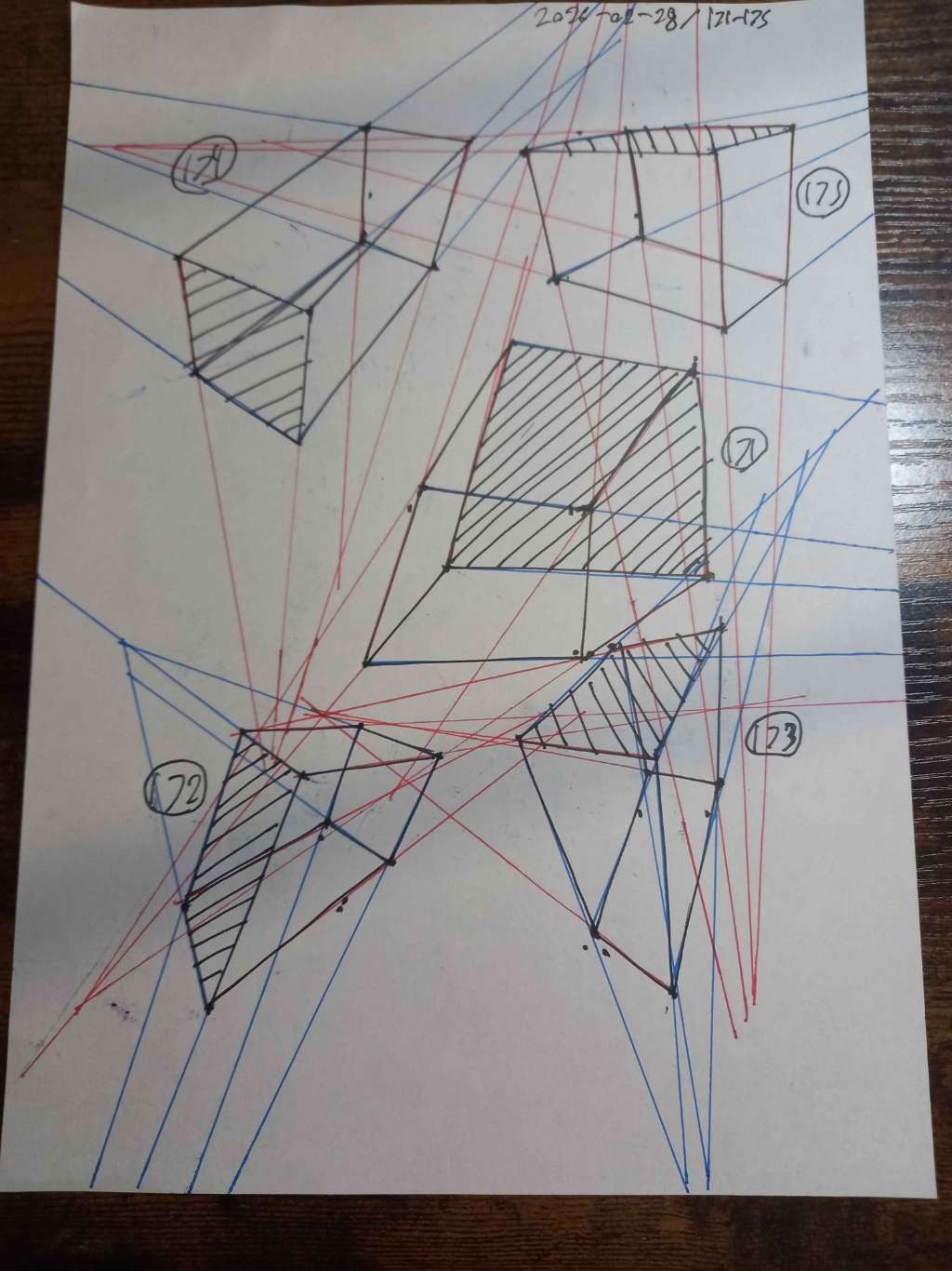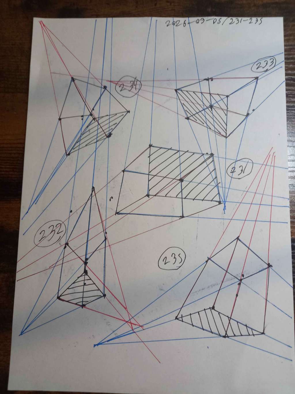 Your convergences also continue to improve, though there are still instances of lines pairing off, like in box 105, box 173, and box 232. While they were less frequent towards the end, this diagram may be helpful to you. In these boxes, the inner lines (green and orange) diverge instead of converging at the vanishing point. Keeping in mind the angles of neighboring lines can help when planning the box's construction.