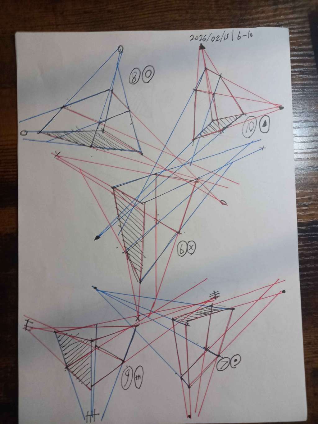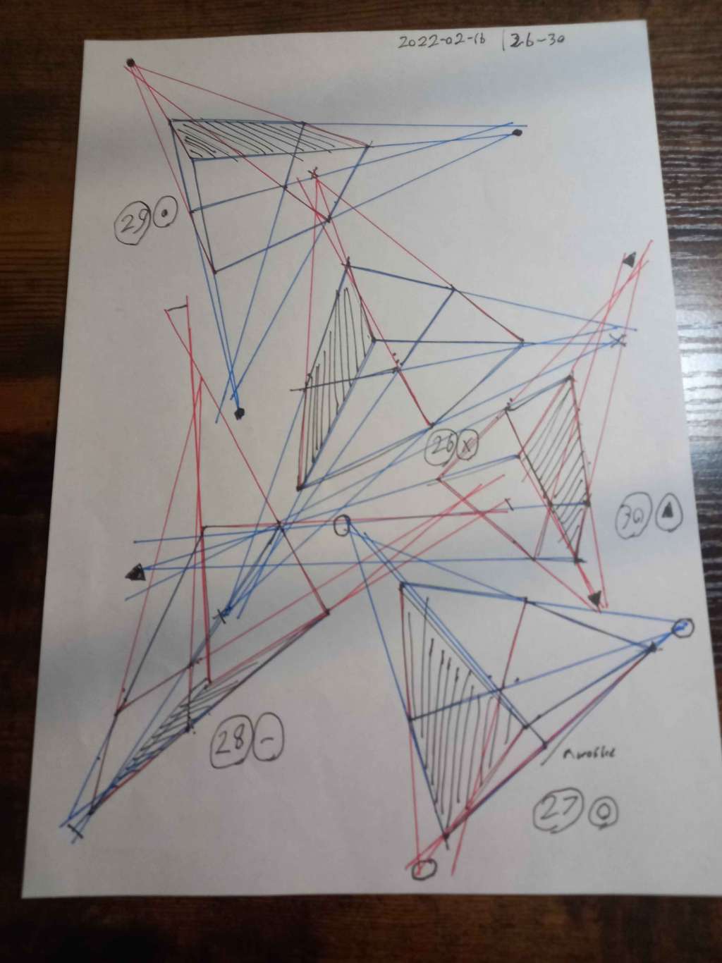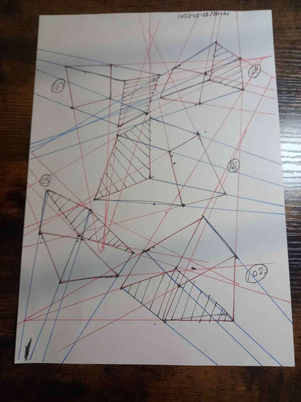 Your convergences also continue to improve, though there are still instances of lines pairing off, like in box 105, box 173, and box 232. While they were less frequent towards the end, this diagram may be helpful to you. In these boxes, the inner lines (green and orange) diverge instead of converging at the vanishing point. Keeping in mind the angles of neighboring lines can help when planning the box's construction.