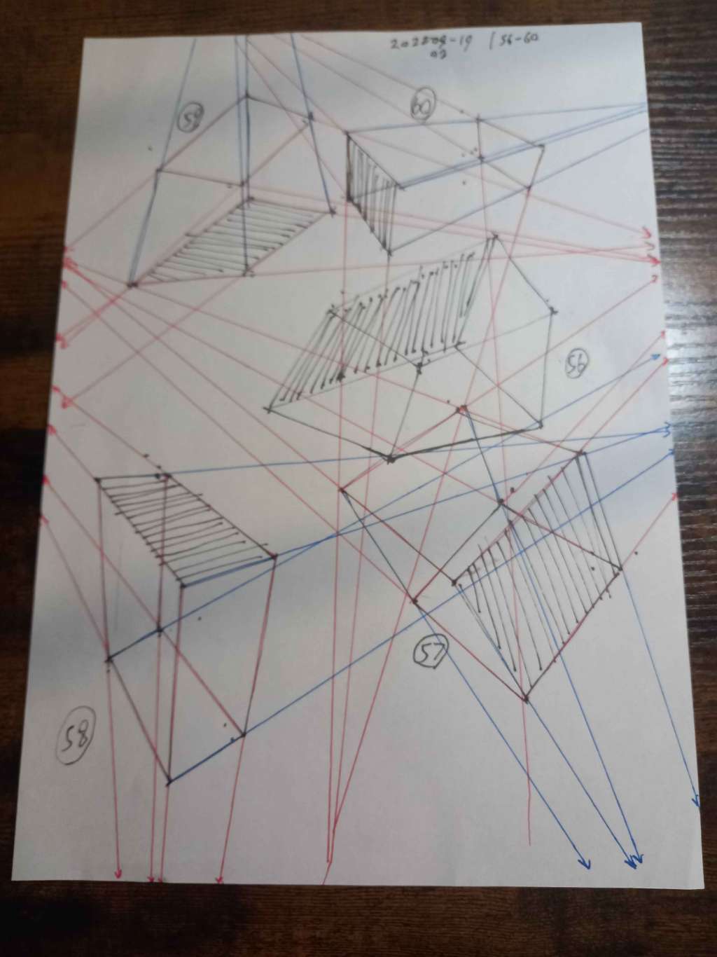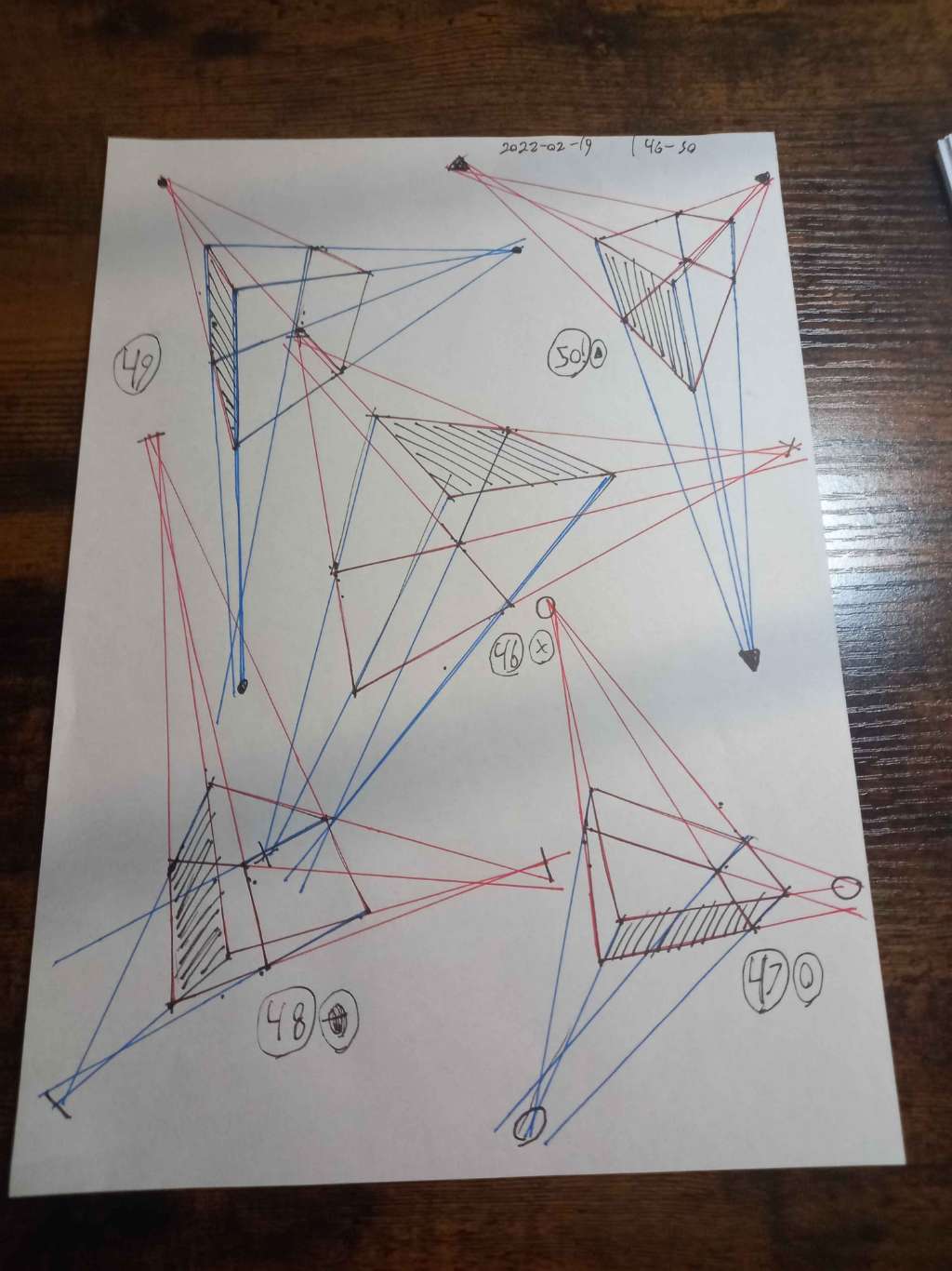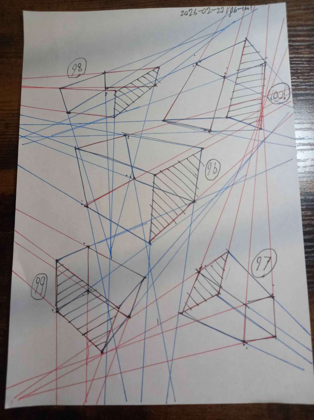 For the first 50, your lines are clean overall. However, I did see some arcing throughout the set. I also noticed some lines that overshot their end points. Your convergences also show good accuracy, though I did see some lines pair off and converge towards two vanishing points, like in box 8, box 26, and box 47.