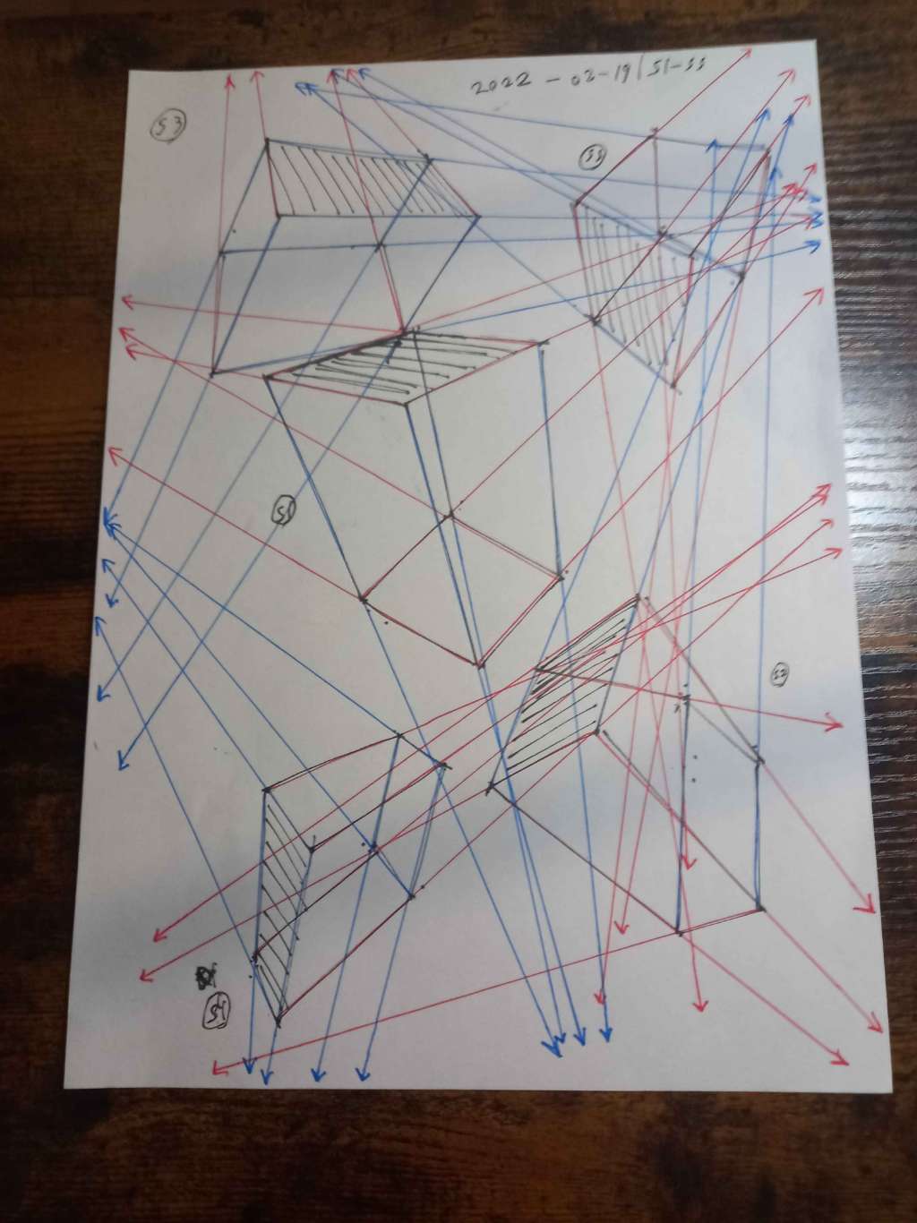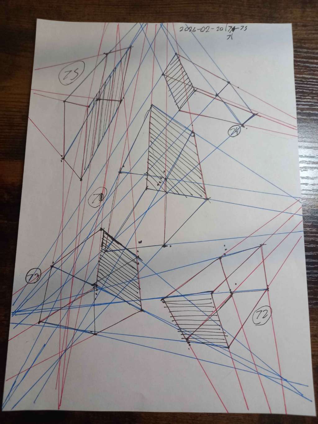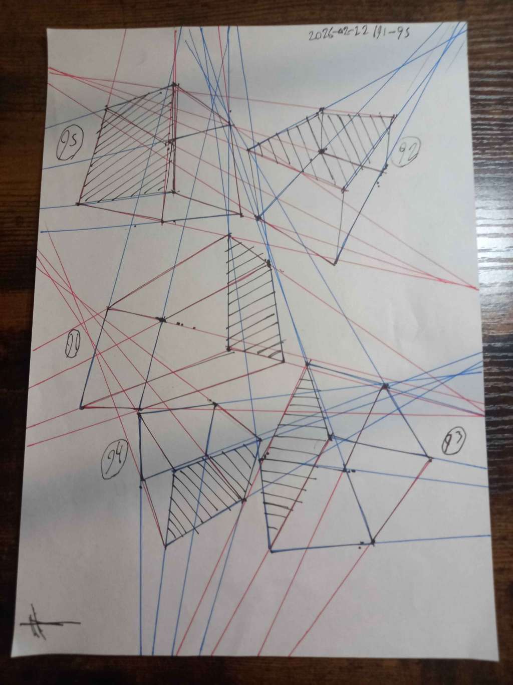 For the first 50, your lines are clean overall. However, I did see some arcing throughout the set. I also noticed some lines that overshot their end points. Your convergences also show good accuracy, though I did see some lines pair off and converge towards two vanishing points, like in box 8, box 26, and box 47.
