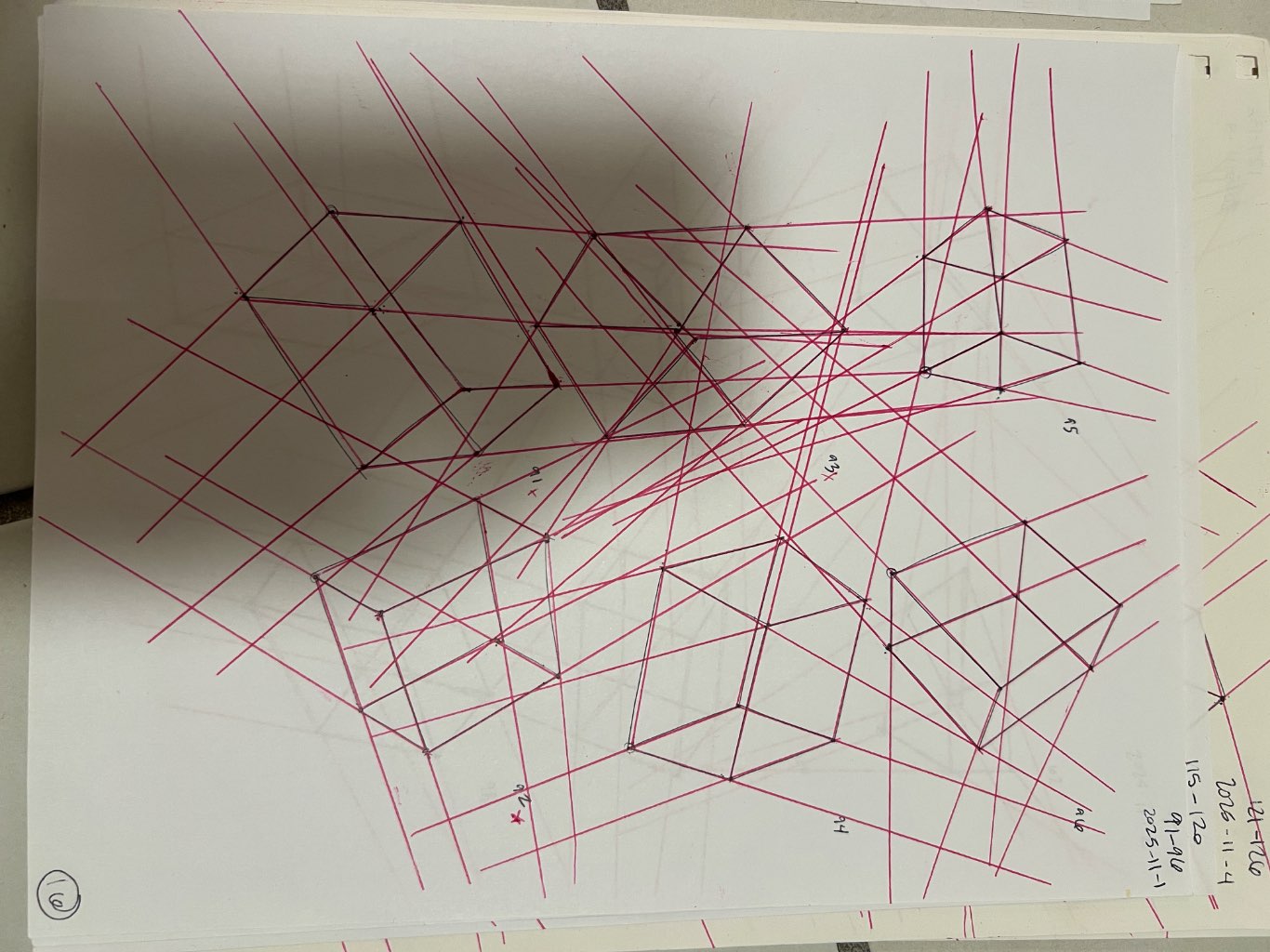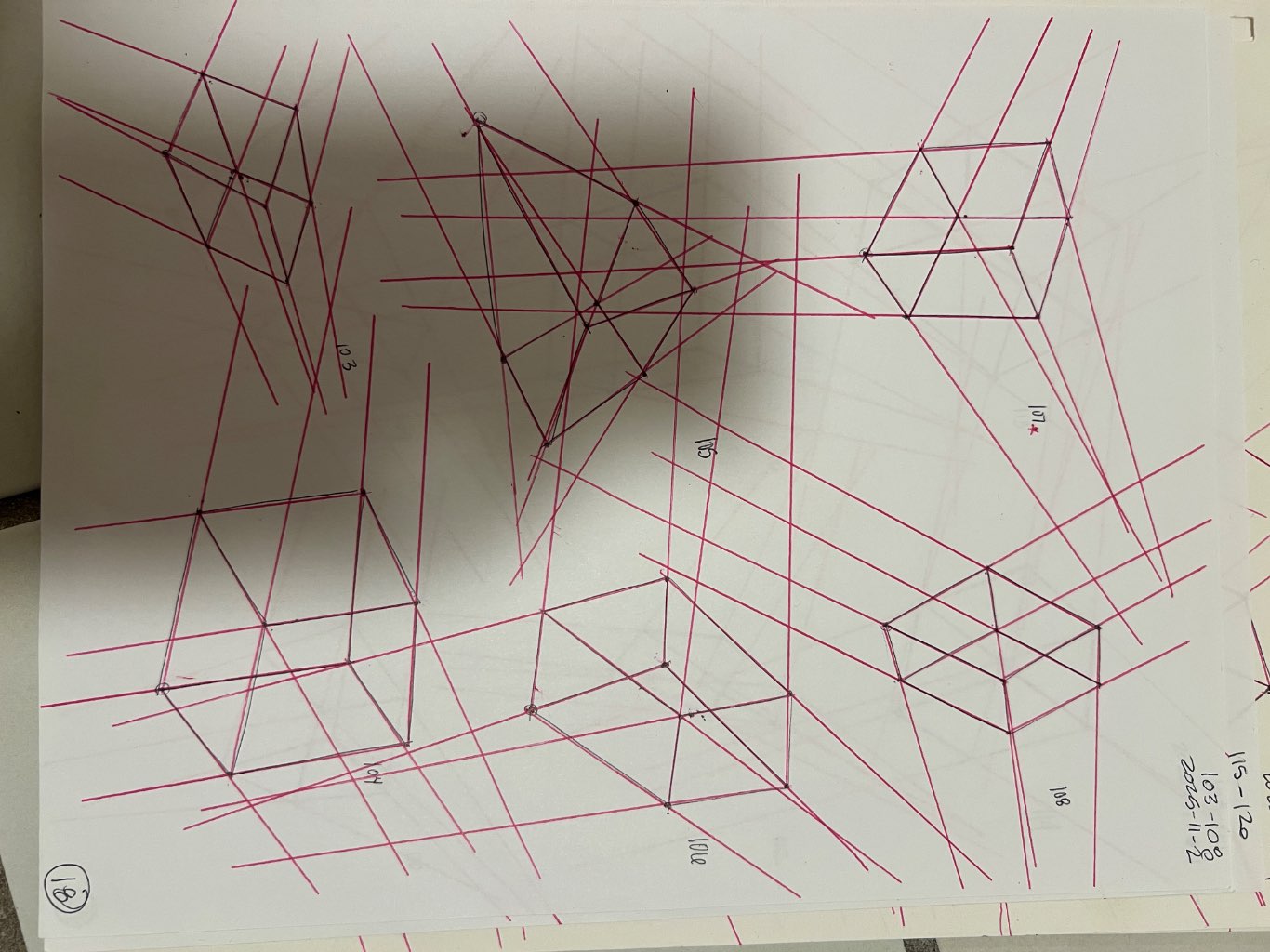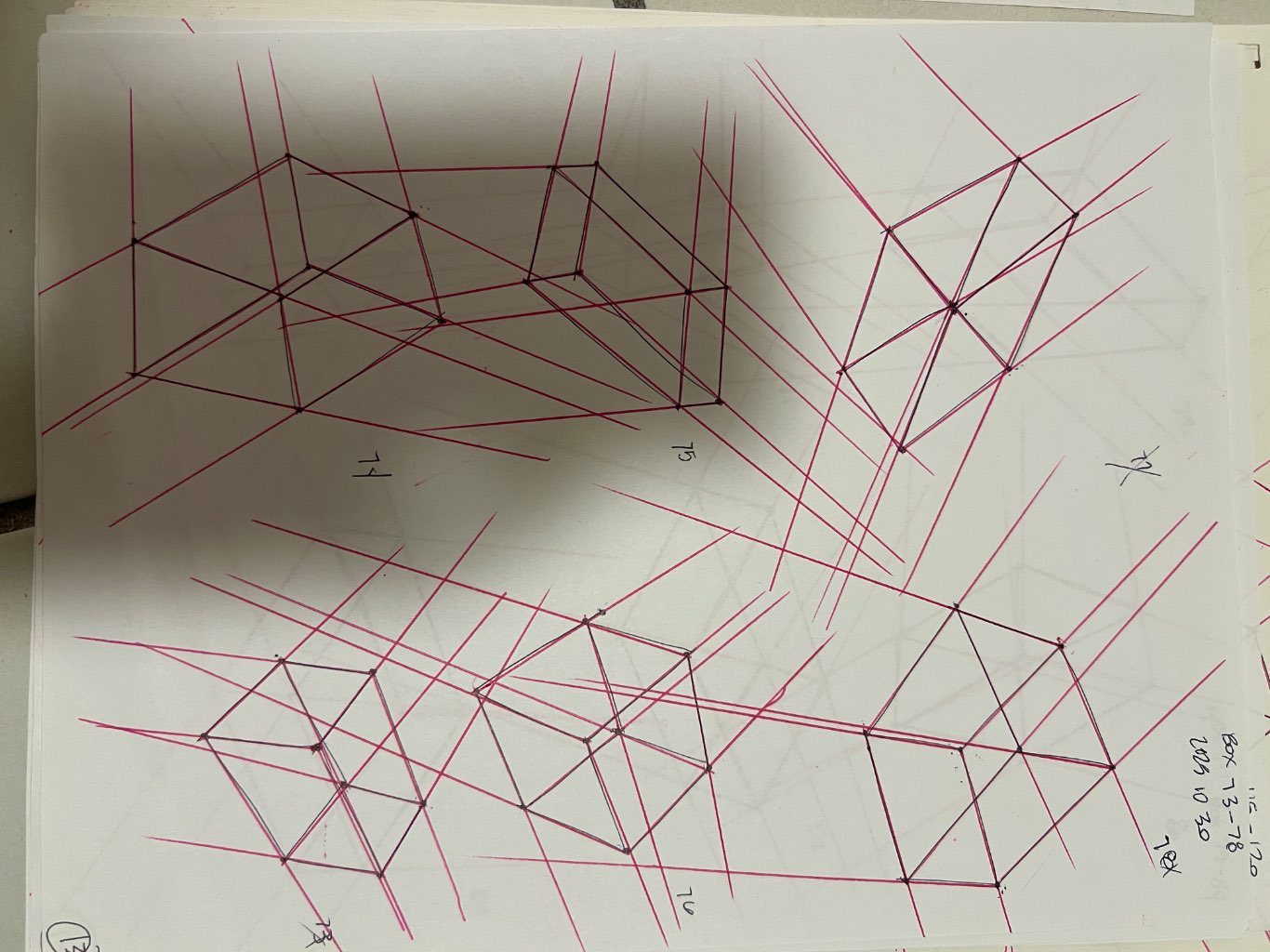 Your convergences also continue to improve, though there are still instances of lines pairing off, like in box 106, box 174, and box 222. In these boxes, the inner lines (green and orange in this diagram) diverge instead of converging at the vanishing point. Keeping in mind the angles of neighboring lines can help when planning the box's construction.