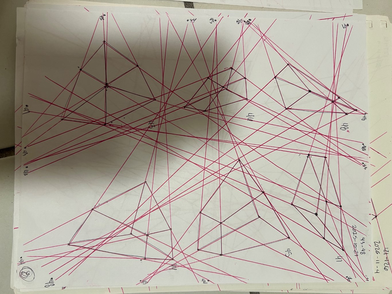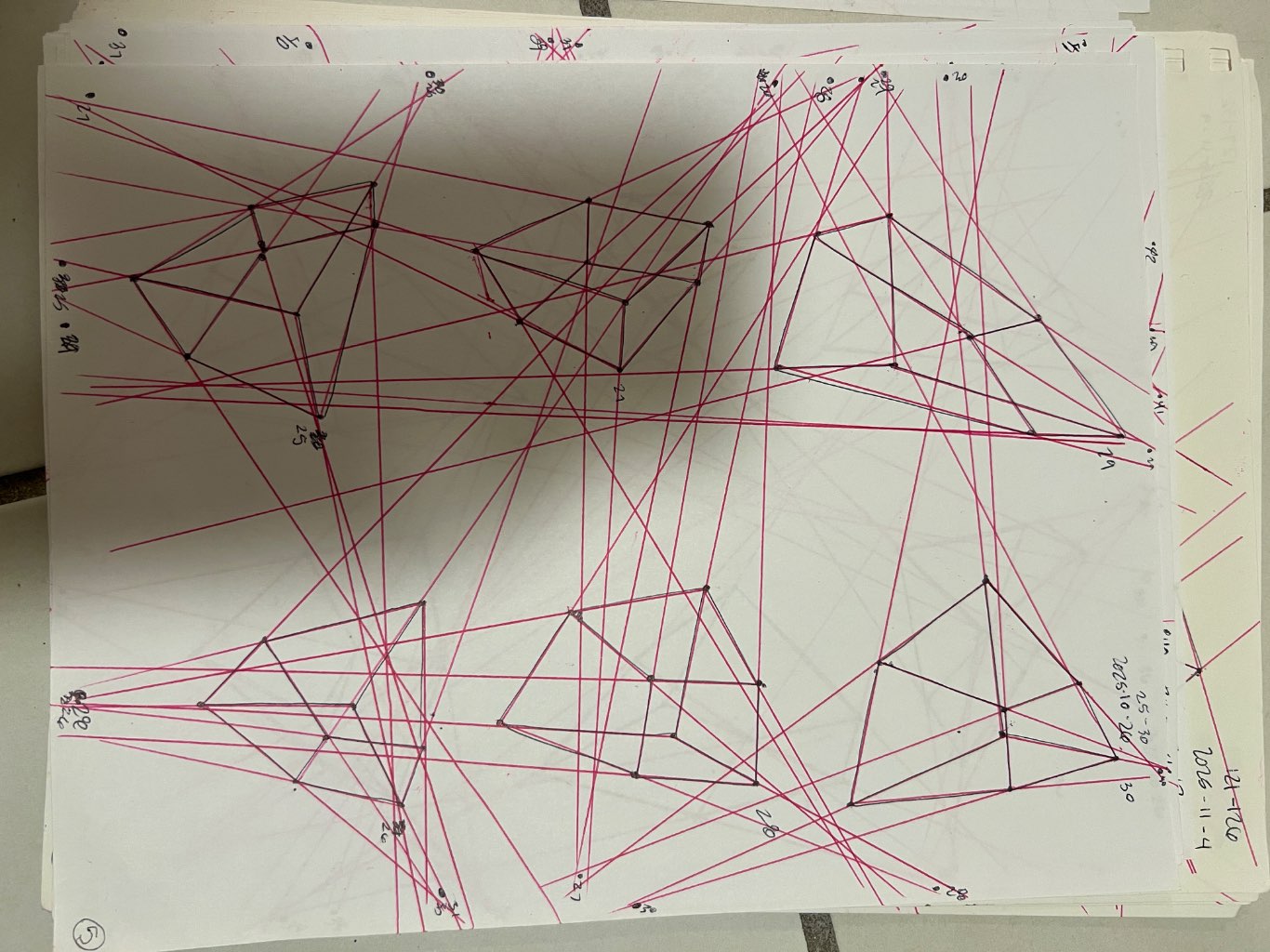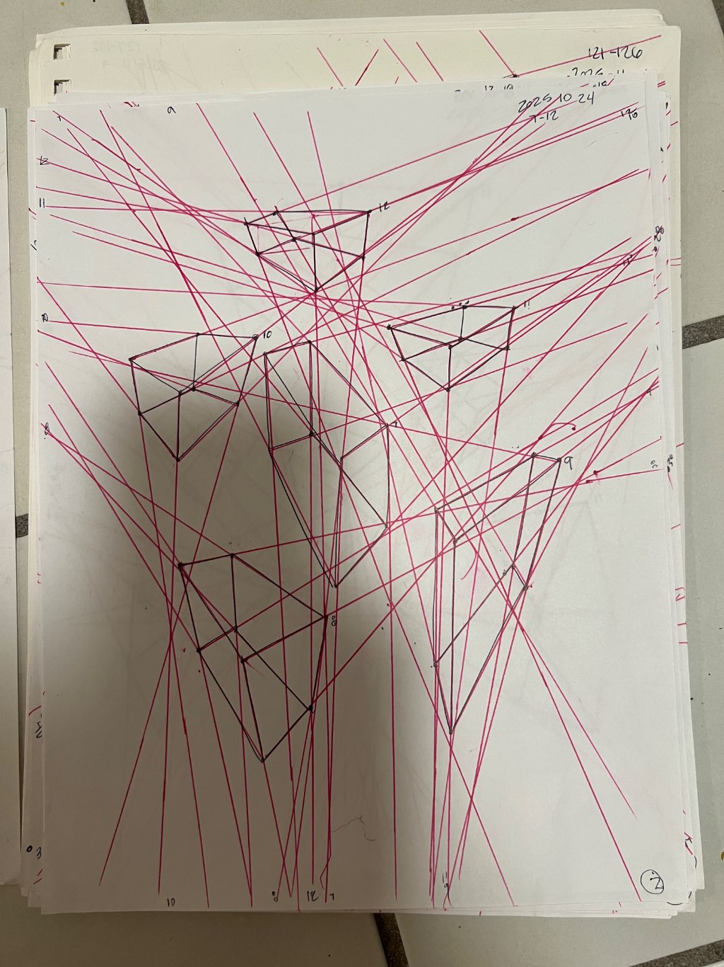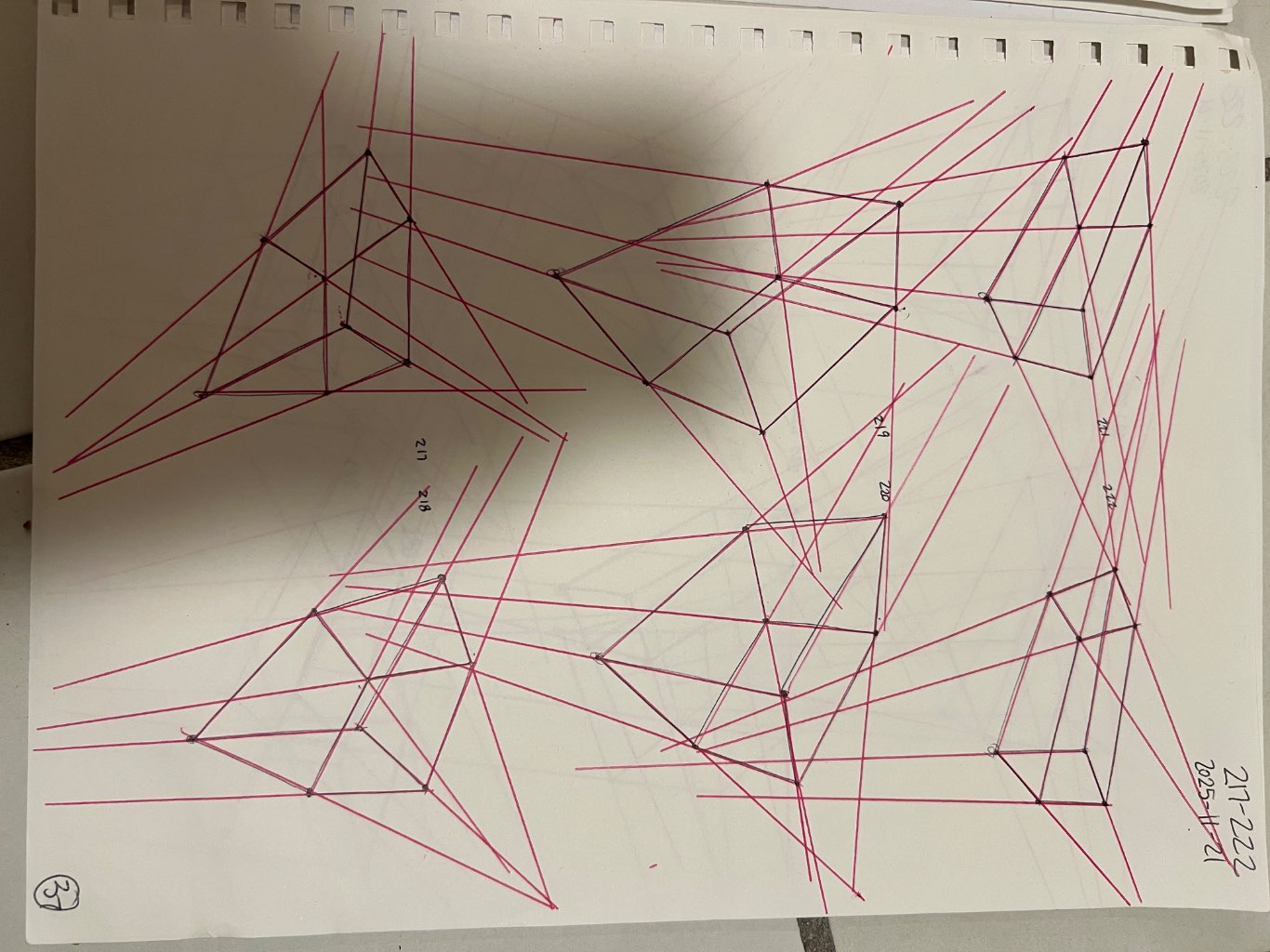 Your convergences also continue to improve, though there are still instances of lines pairing off, like in box 106, box 174, and box 222. In these boxes, the inner lines (green and orange in this diagram) diverge instead of converging at the vanishing point. Keeping in mind the angles of neighboring lines can help when planning the box's construction.