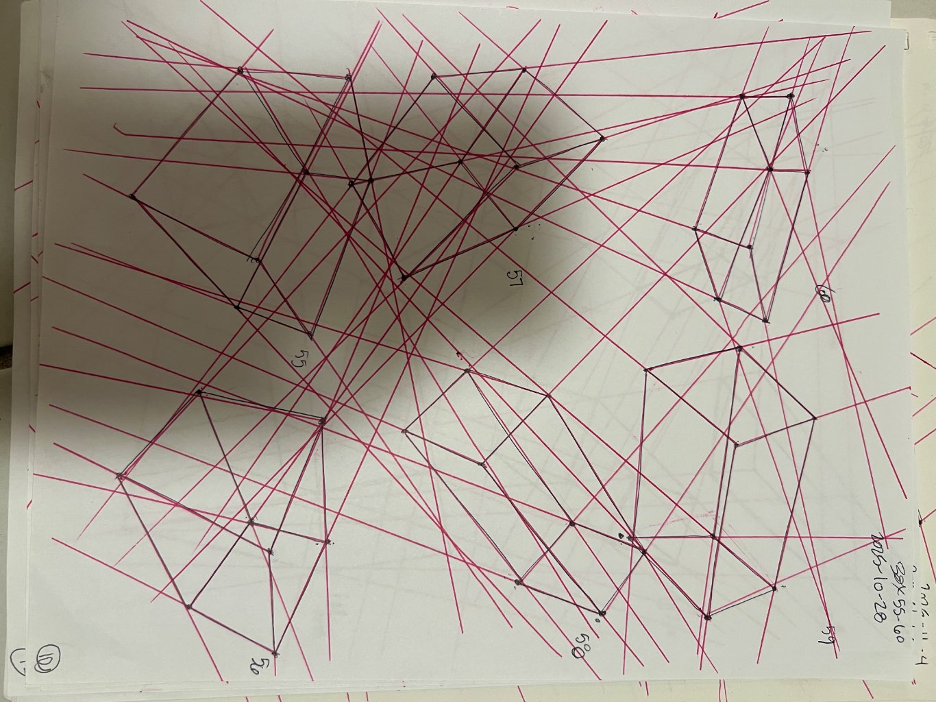 For the first 50, your lines are clean overall. However, I did see some wobbling throughout the set. Your convergences also show good accuracy, though I did see some lines pair off and converge towards two vanishing points, like box 8, box 25, and box 43.