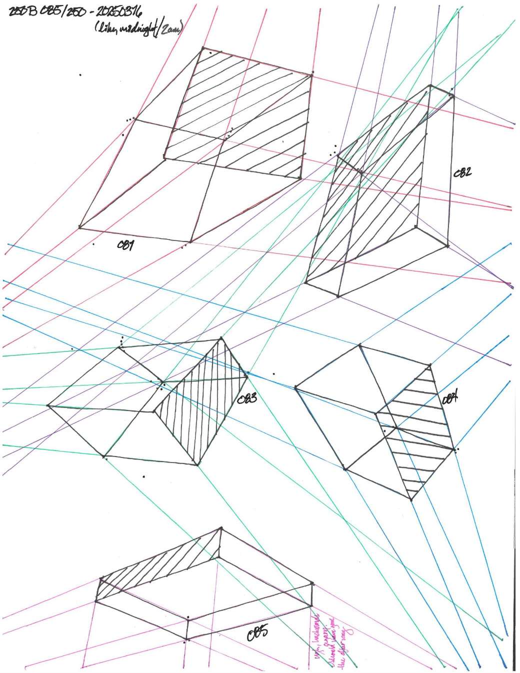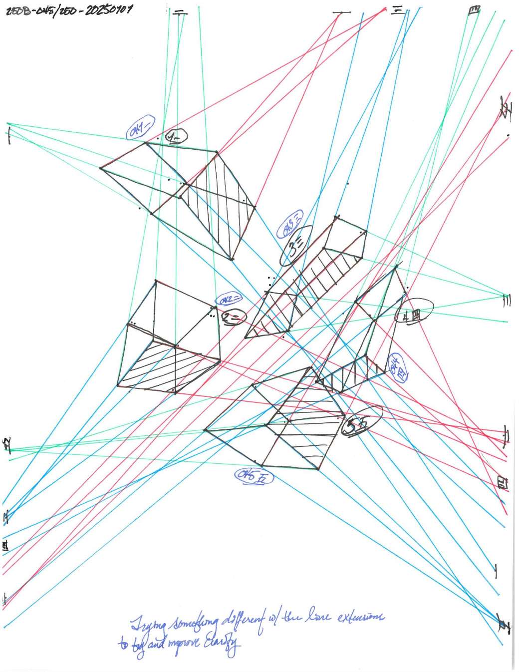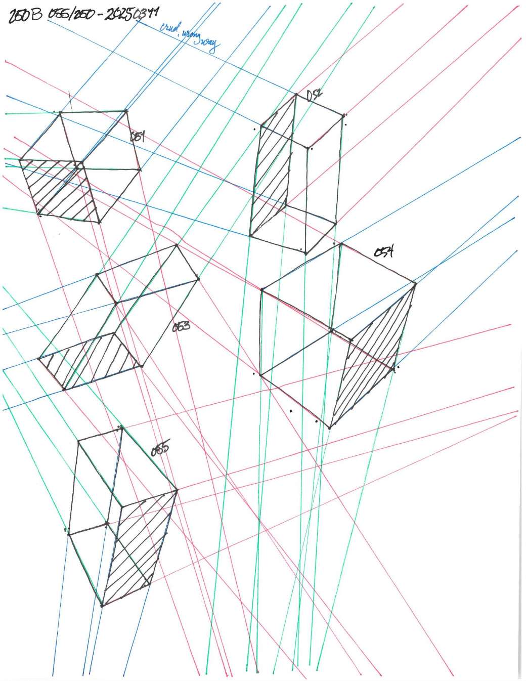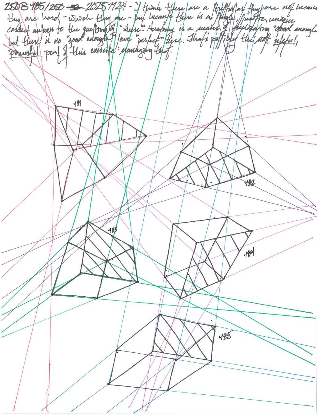Your convergences also continue to improve, though there are still instances of lines pairing off, like in box 120, box 183, and box 227. In these boxes, the inner lines (green and orange in this diagram) diverge instead of converging at the vanishing point. Keeping in mind the angles of neighboring lines can help when planning the box's construction.