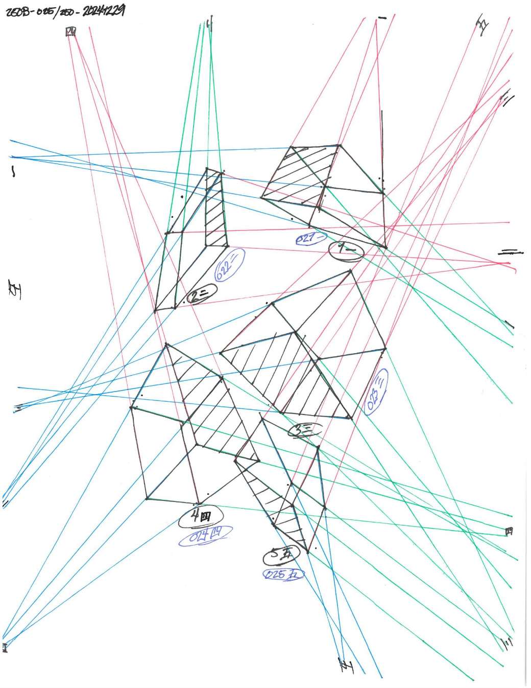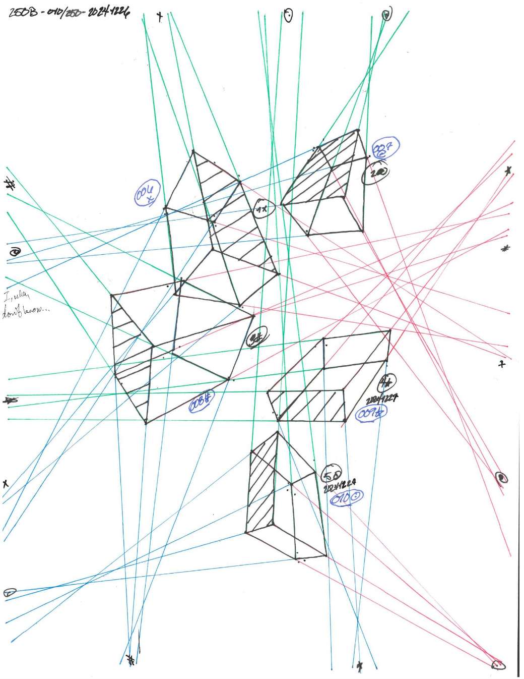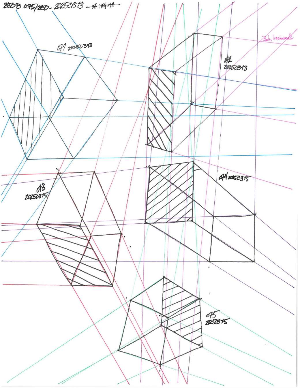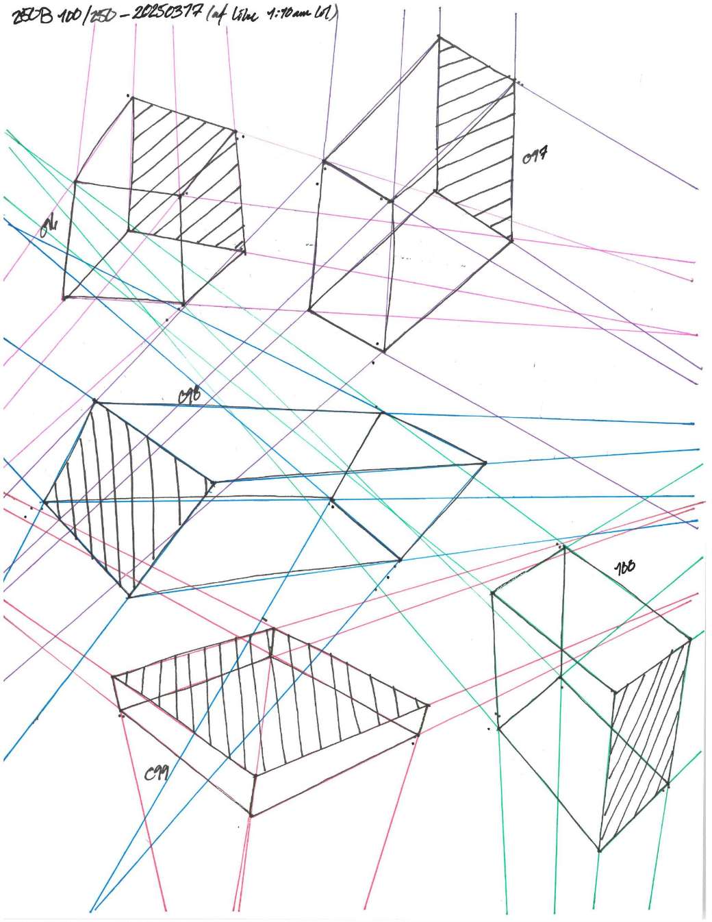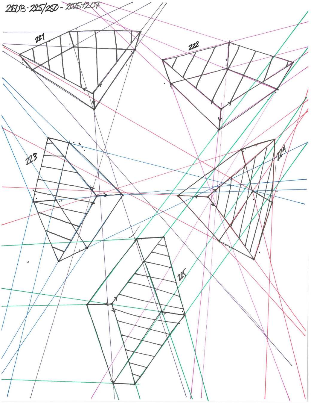 Your convergences also continue to improve, though there are still instances of lines pairing off, like in box 120, box 183, and box 227. In these boxes, the inner lines (green and orange in this diagram) diverge instead of converging at the vanishing point. Keeping in mind the angles of neighboring lines can help when planning the box's construction.