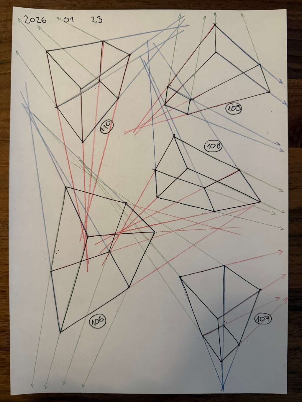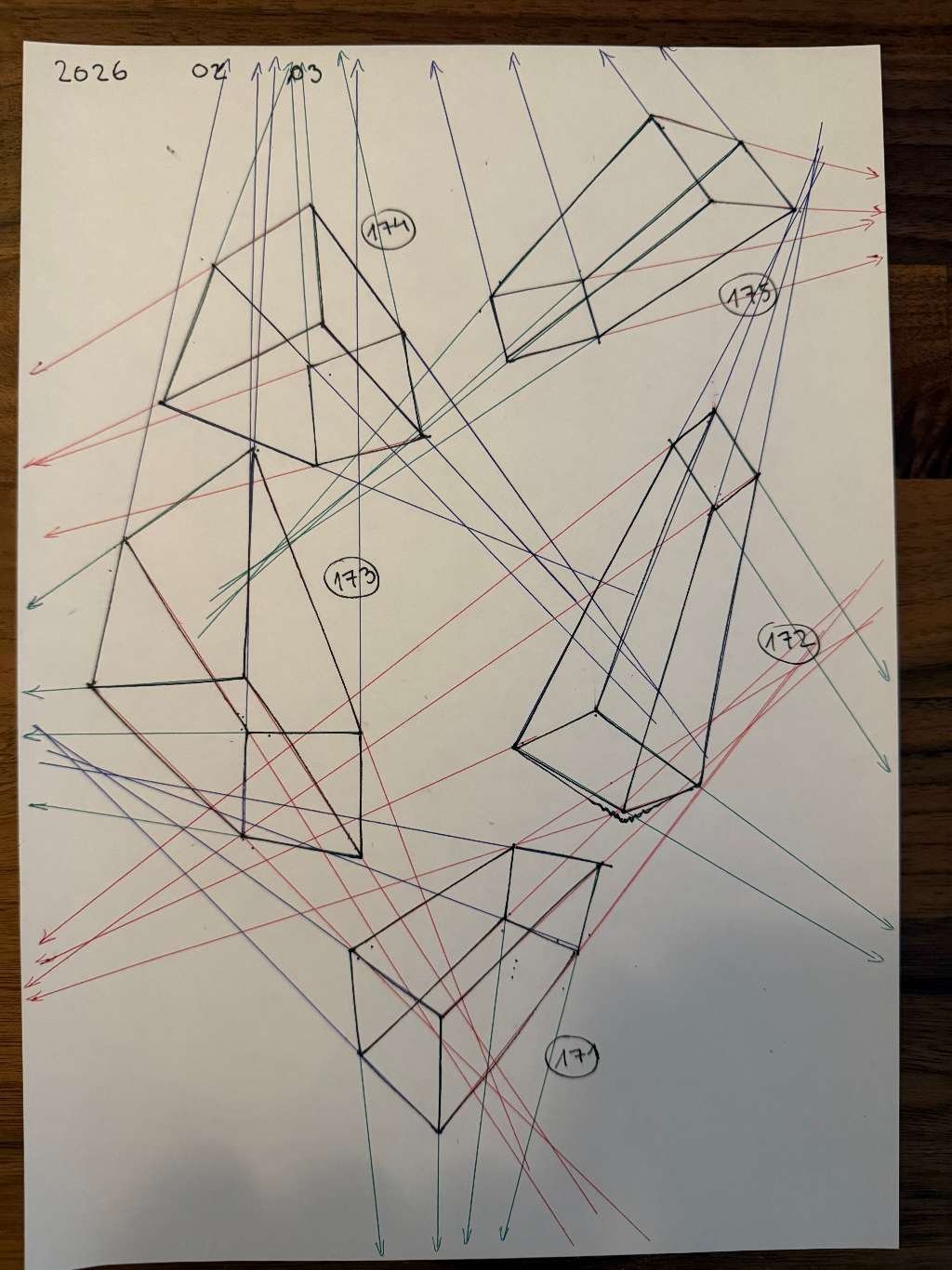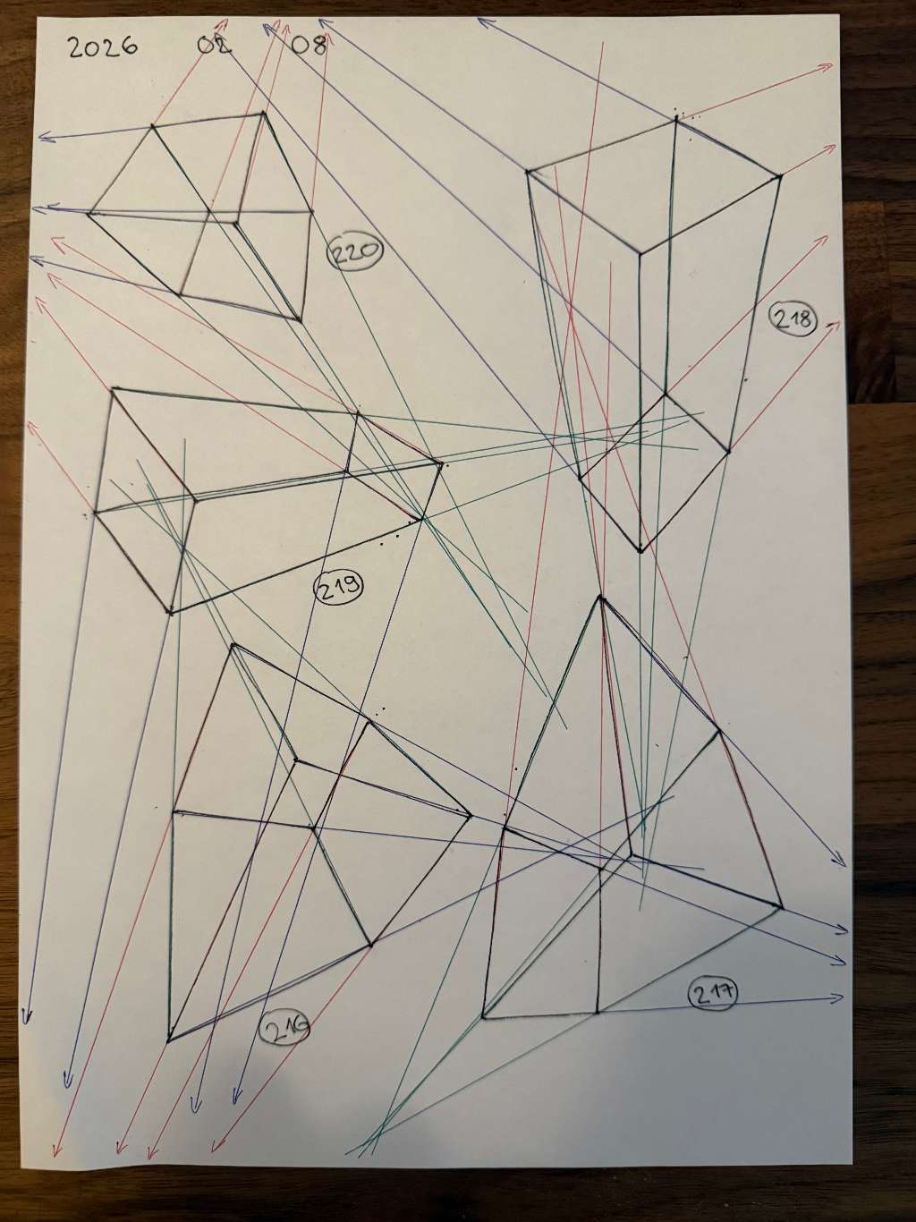 Your convergences also continue to improve, though there are still instances of lines pairing off, like in box 110, box 173, and box 217. While they were less frequent towards the end, this diagram may be helpful to you. In these boxes, the inner lines (green and orange) diverge instead of converging at the vanishing point. Keeping in mind the angles of neighboring lines can help when planning the box's construction.
