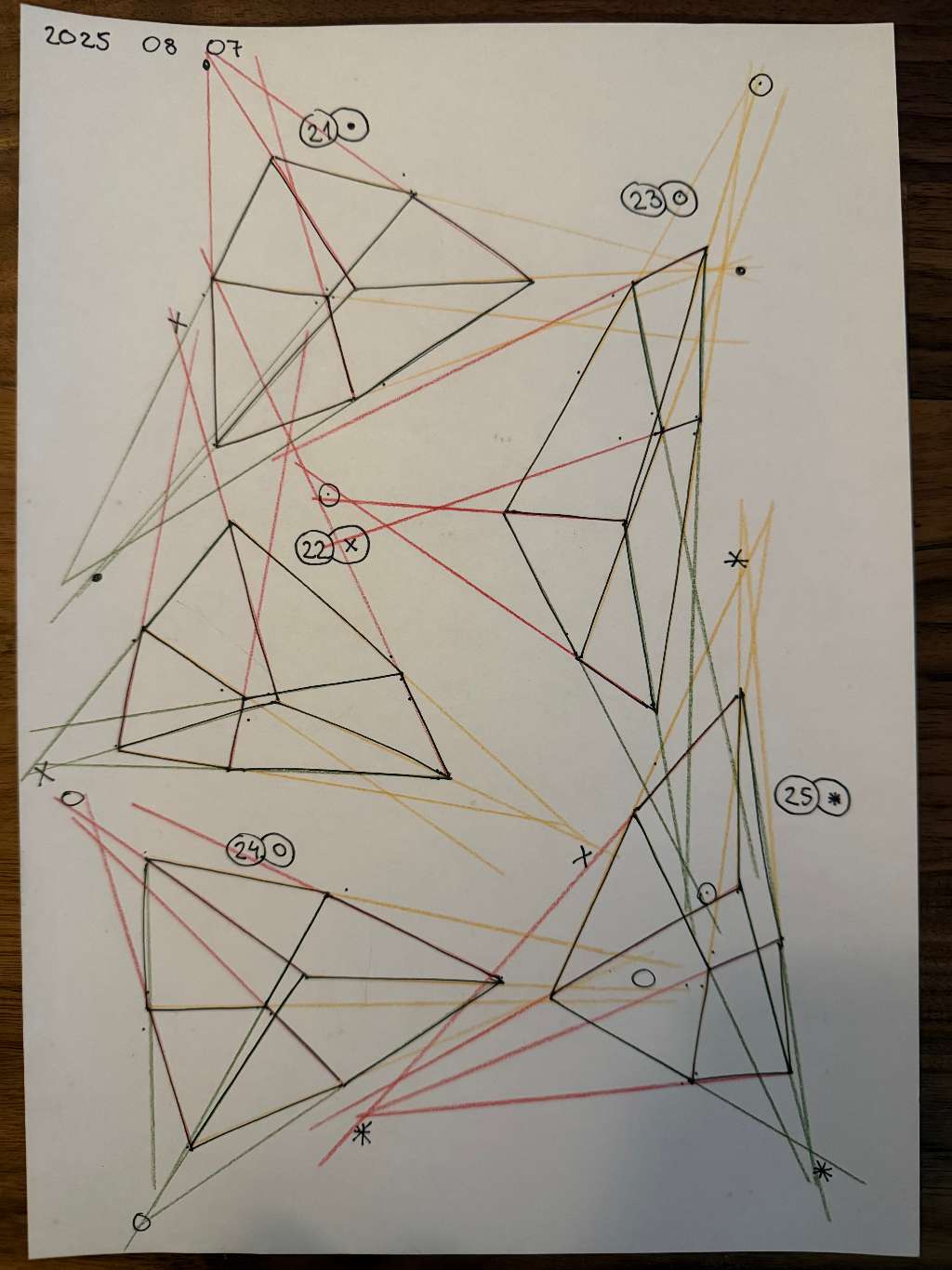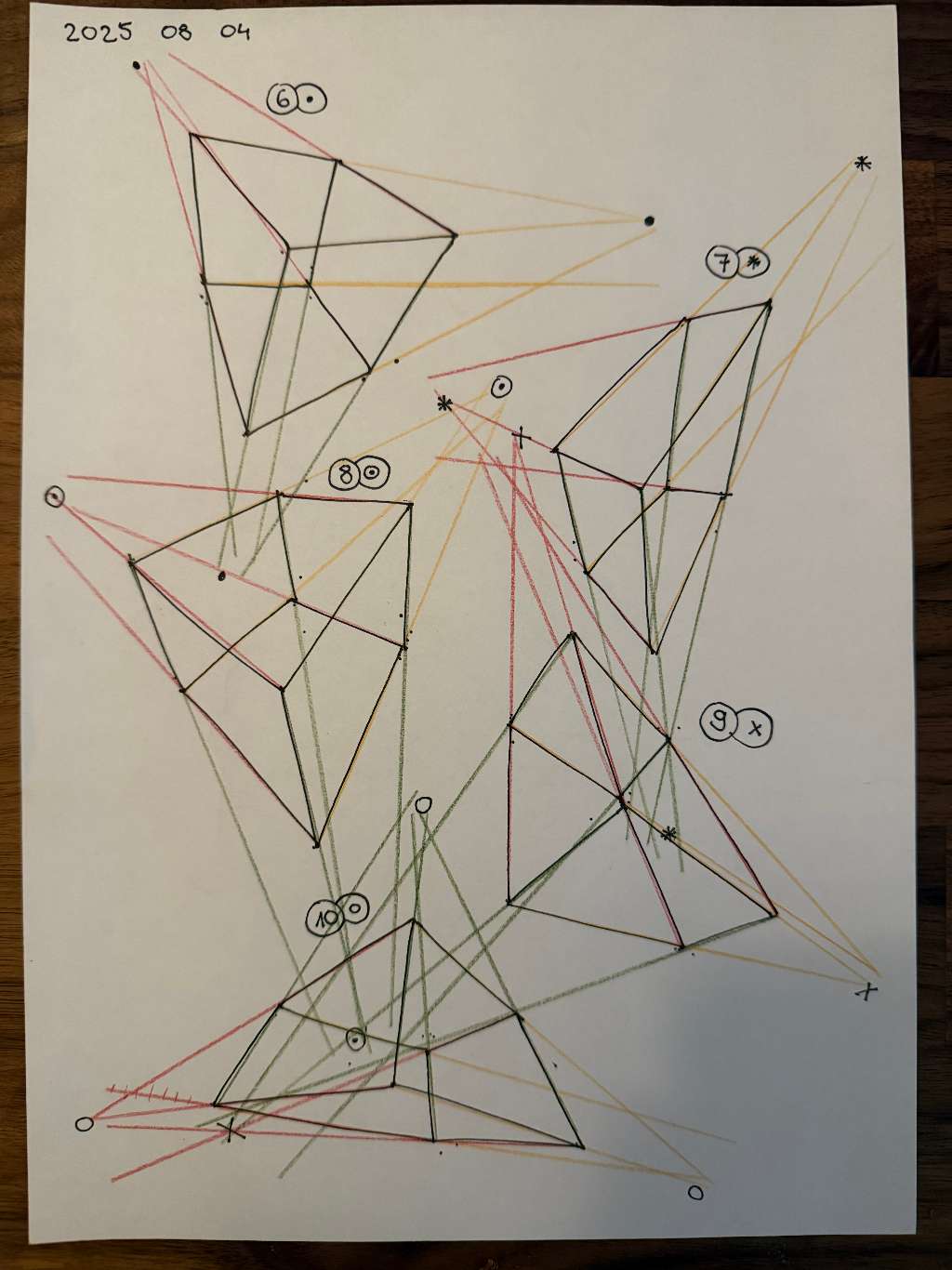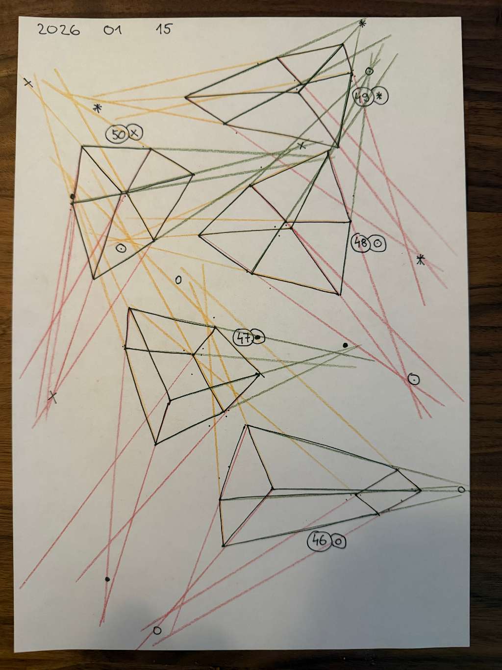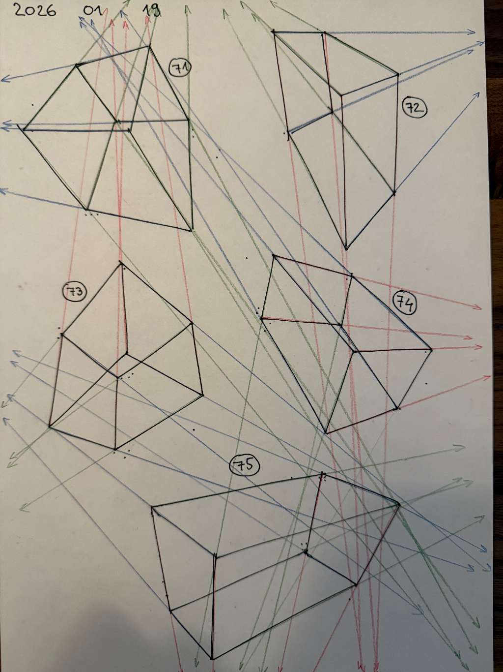 Your convergences also continue to improve, though there are still instances of lines pairing off, like in box 110, box 173, and box 217. While they were less frequent towards the end, this diagram may be helpful to you. In these boxes, the inner lines (green and orange) diverge instead of converging at the vanishing point. Keeping in mind the angles of neighboring lines can help when planning the box's construction.