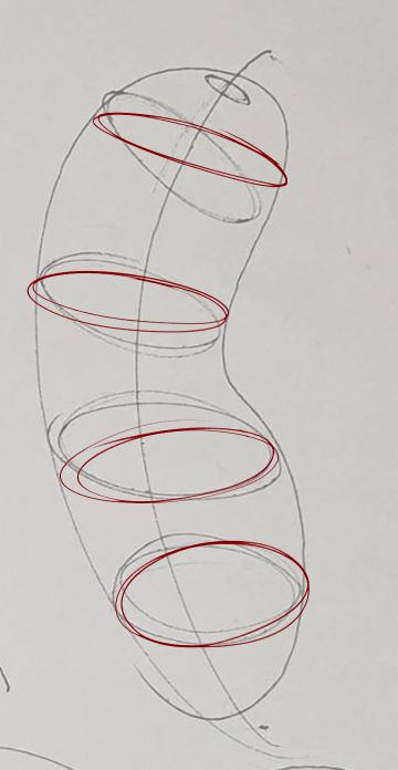 • Your contour ellipses are drawn with confidence, which helps to maintain an even, consistent shape and curvature. When it comes to alignment however, you do have a strong tendency towards having them slant a little one way or the other, instead of being aligned to the central flow of the sausage (as shown here), so you'll want to pay attention to that when practicing this exercise in the future.