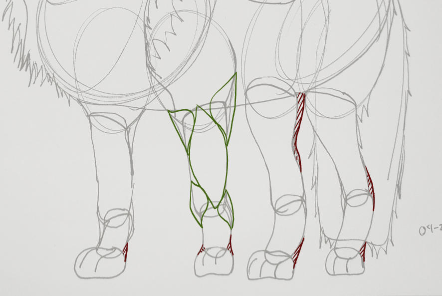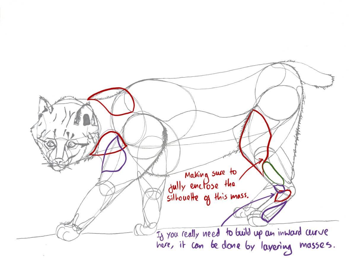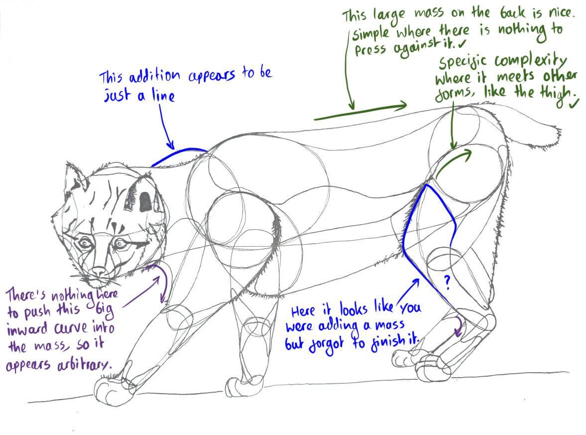 • There a re a couple of spots where you’d included an inward curve in the silhouette of an additional mass along the outer edge of the construction, where it is exposed to fresh air and there is nothing physically present to press into it. Try to stick to simpler outward curves in these areas, and if you really need to build up an inwards curve with additional masses, this can be done by layering them, as I’ve shown along the hind leg in the drawover.