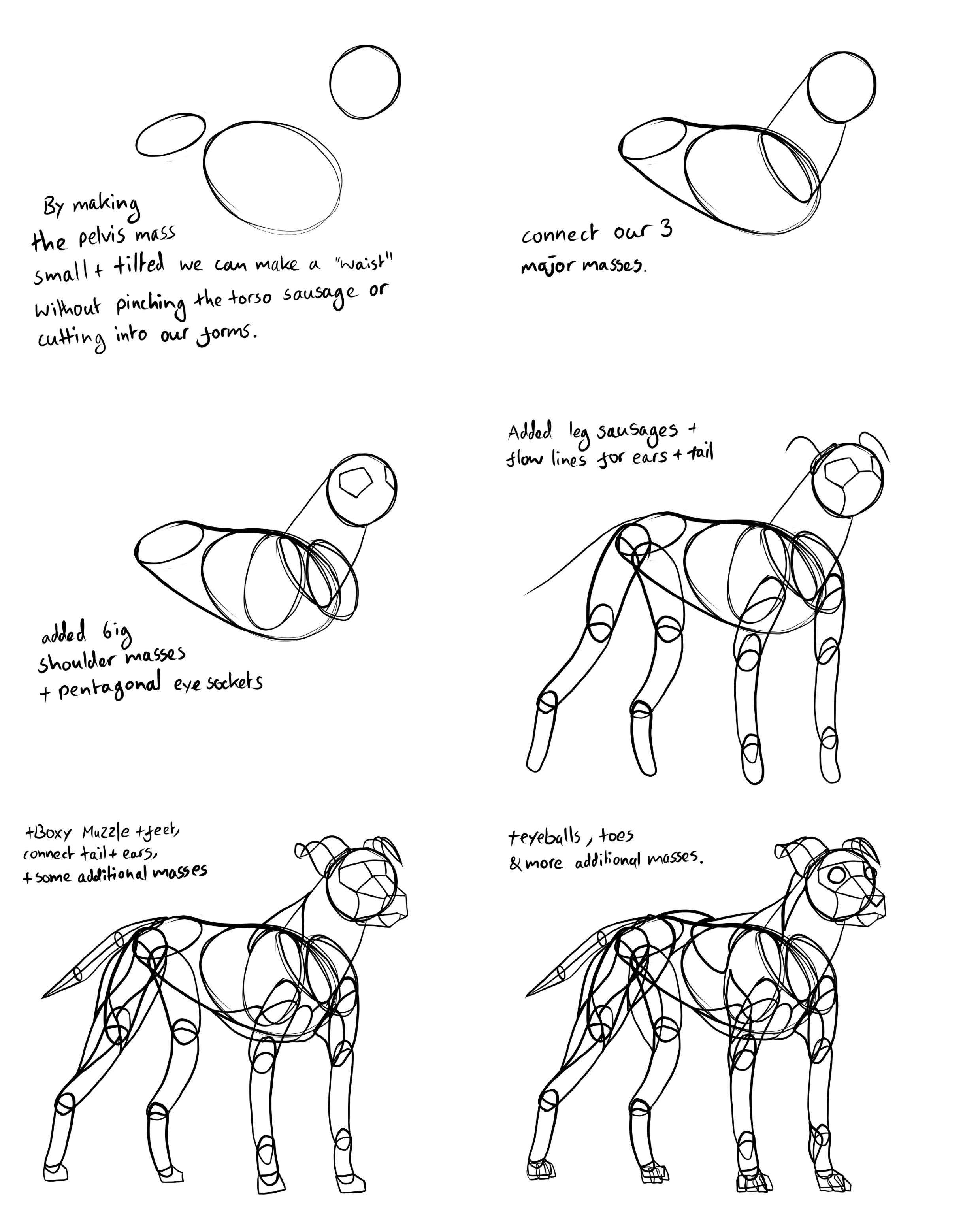 So, one of the first steps for a quadruped construction is to combine the ribcage and pelvis masses into a torso sausage. When doing this, we want to stick fairly closely to the characteristics of a simple sausage form, as this simplicity helps it to feel solid. I noticed on about half your quadrupeds that you’d pinched the underside of this torso sausage inwards, which results in a weaker foundation upon which to build the rest of the construction. Sometimes animals don’t really look like they sag in the middle. When we want to build an animal with a narrow waist, instead of adding complexity to the torso sausage, we can adjust the size and tilt of the pelvis mass, as shown in this dog demo which I put together for a student who ran into a similar issue.