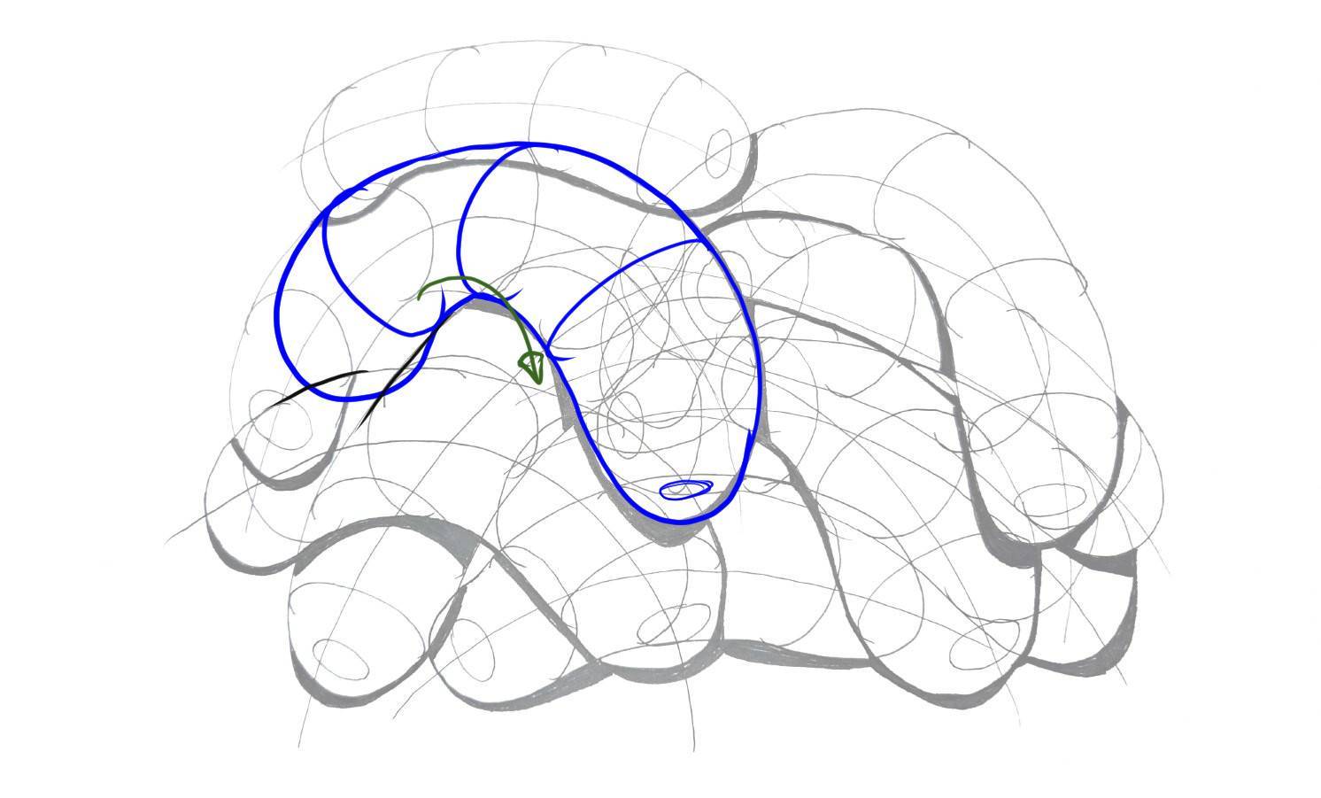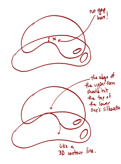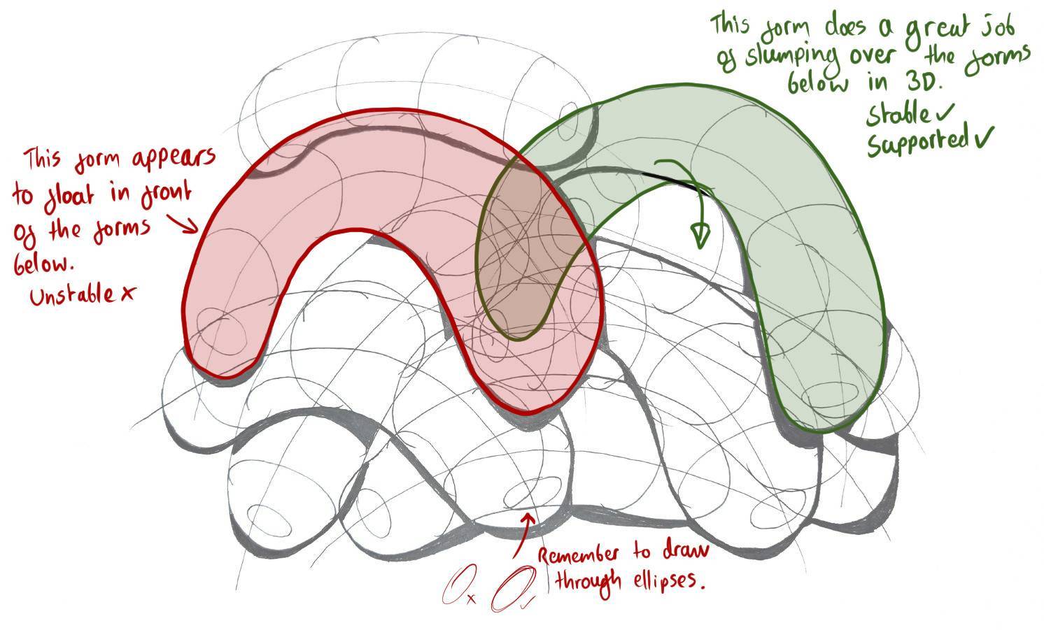 With each form you add, imagine you’re dropping it in from above the pile, and thinking about how gravity will pull it downwards, over and around the forms that are already in place. One thing that can help here, (in addition to avoiding laying forms parallel to one another as discussed in the exercise instructions) is to have the edge of the upper form follow the surface of the lower form like a 3D contour curve, as shown in these diagrams.This will help to create the illusion that the forms are wrapping around each other. You can see this applied to the form I’ve redrawn in blue here allowing it to sag over the form below, and swapping the direction of the contour curves allow the right-hand end of the form to face towards the viewer.