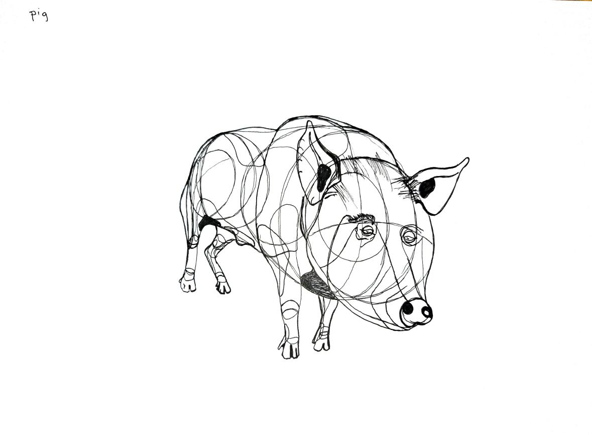 Moving on to your animal constructions, I’m pleased to see you’ve made a concerted effort to take actions on your constructions that reinforce the 3D illusion, and it looks like there is a fair bit of growth occurring through the set. This pig in particular has some tricky foreshortening, but you’ve been clear about showing your understanding of how the pieces fit together in 3D space so it doesn’t fall flat. I do have a few recommendations for you, which I’ll discuss below, but overall you’ve done a bang up job.