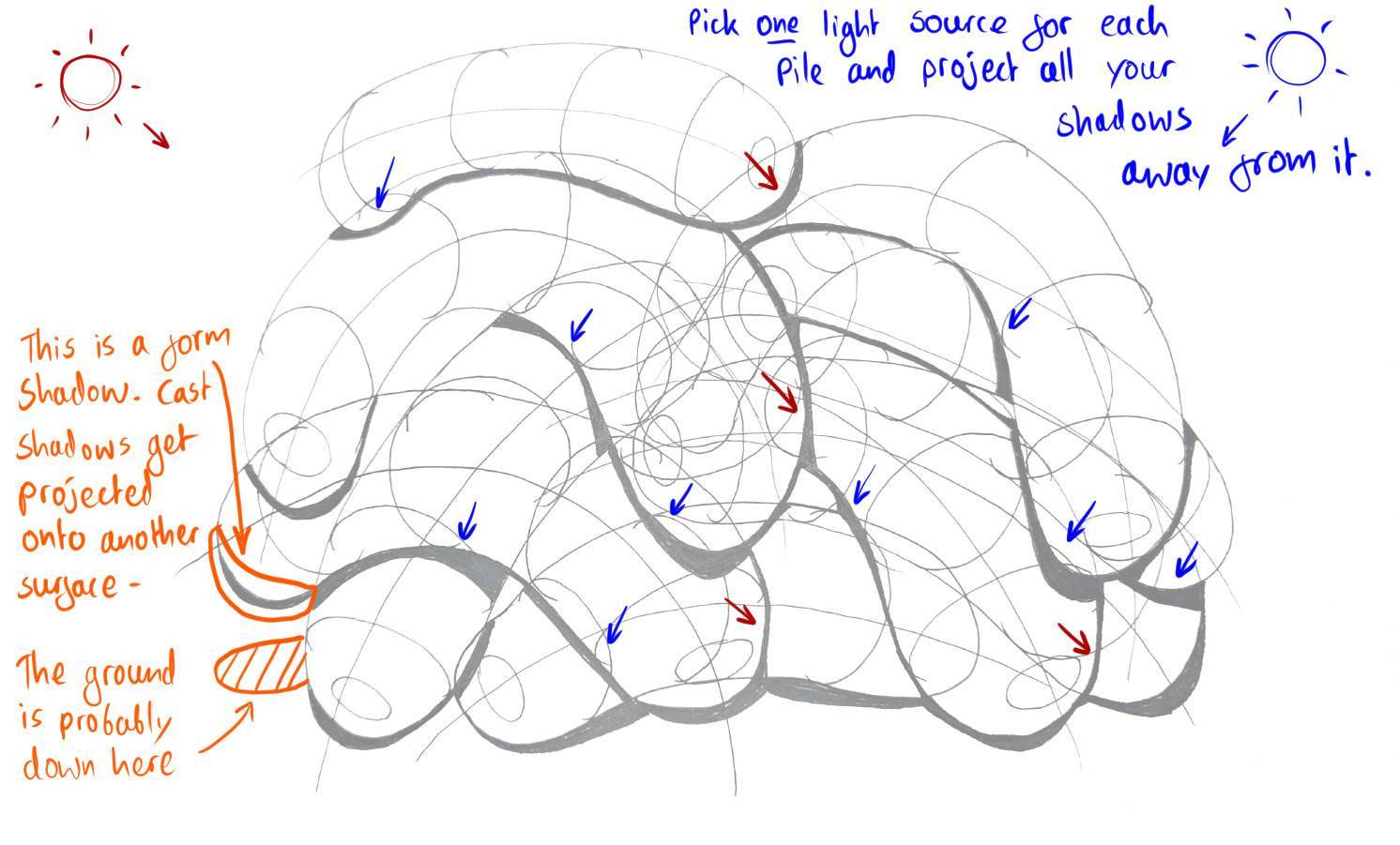 When adding cast shadows, try to keep a single light source in mind for any given pile, and project all your shadows away from it. As noted here you appear to be casting the shadows in multiple directions at once, which will give the impression that the light source is moving around. Also keep in mind that cast shadows occur when one form blocks the light from hitting another surface so they can’t cling to the form like the area circled in orange. Instead, in this instance the shadow would be projected down onto the ground plane below.