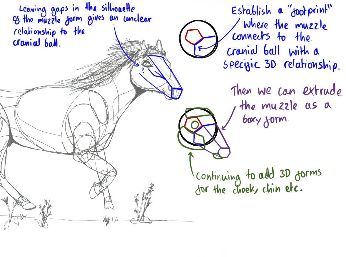 Try your best to employ this method when doing constructional drawing exercises using animals in the future, as closely as you can. Sometimes it seems like it's not a good fit for certain heads, but as shown in the rhino head demo just beneath it on the same page, it can be adapted to work for a wide array of animals. I’m definitely seeing that you’re making an effort to inscribe angular eye sockets onto your cranial balls, but it does look like muzzle construction is something of a sticking point. I’ve put together some notes on this pony which I hope will help you understand how to construct the muzzle as a simple boxy form with a clear 3D connection to the underlying cranial ball.