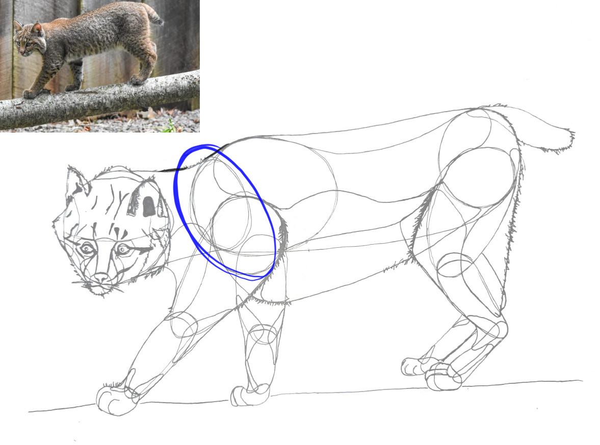 • Along the front of the hind leg, I can see you were intending to construct an additional mass, but left it open-ended. In the drawover I’ve completed it, to give a clearer connection to the underlying sausage form.